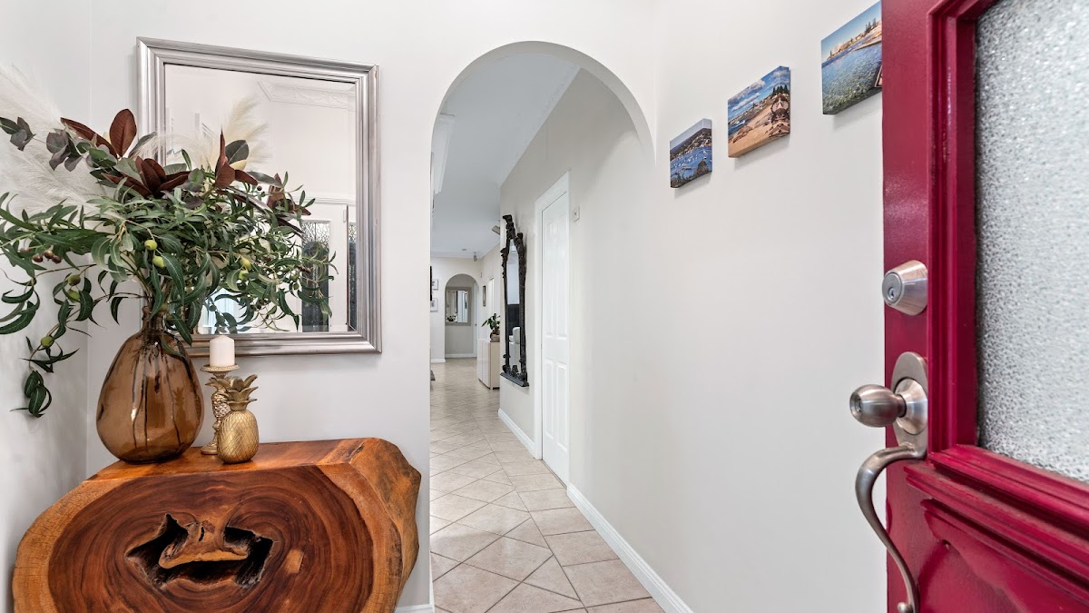 – A welcoming covered porch with decorative stained glass leads you into a spacious entrance featuring extra-high ceilings, ornate cornices and charming tiled flooring to the oversized kitchen, lounge and dining zones, thoughtfully designed for stylish living in our tropical climate