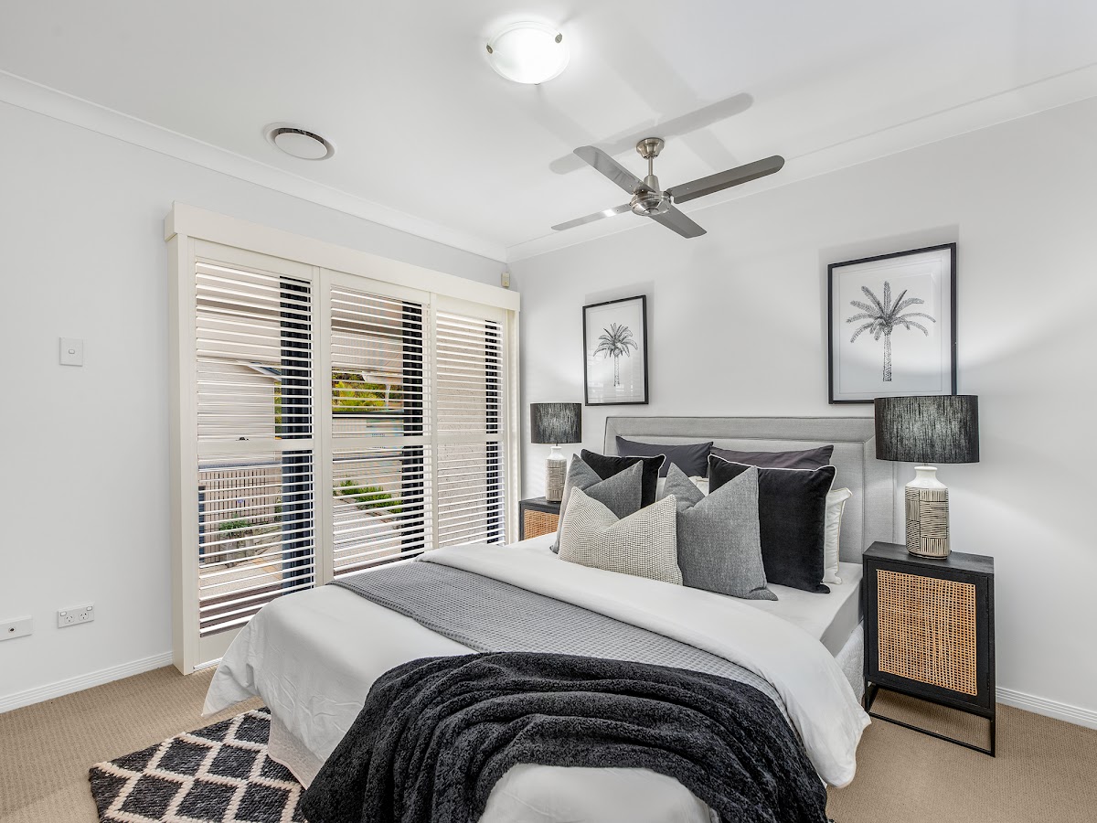 A beautiful timber staircase leads to the bedroom level where the three bedrooms are located. All have ducted air, ceiling fans, built-in robes and feature white plantation shutters and crimsafe security. Both bathrooms feature top mounted vanities, the ensuite has a good-sized walk-in shower and the family bathroom has a shower over bath. Roof cavity storage is conveniently accessed via a pull-down ladder.