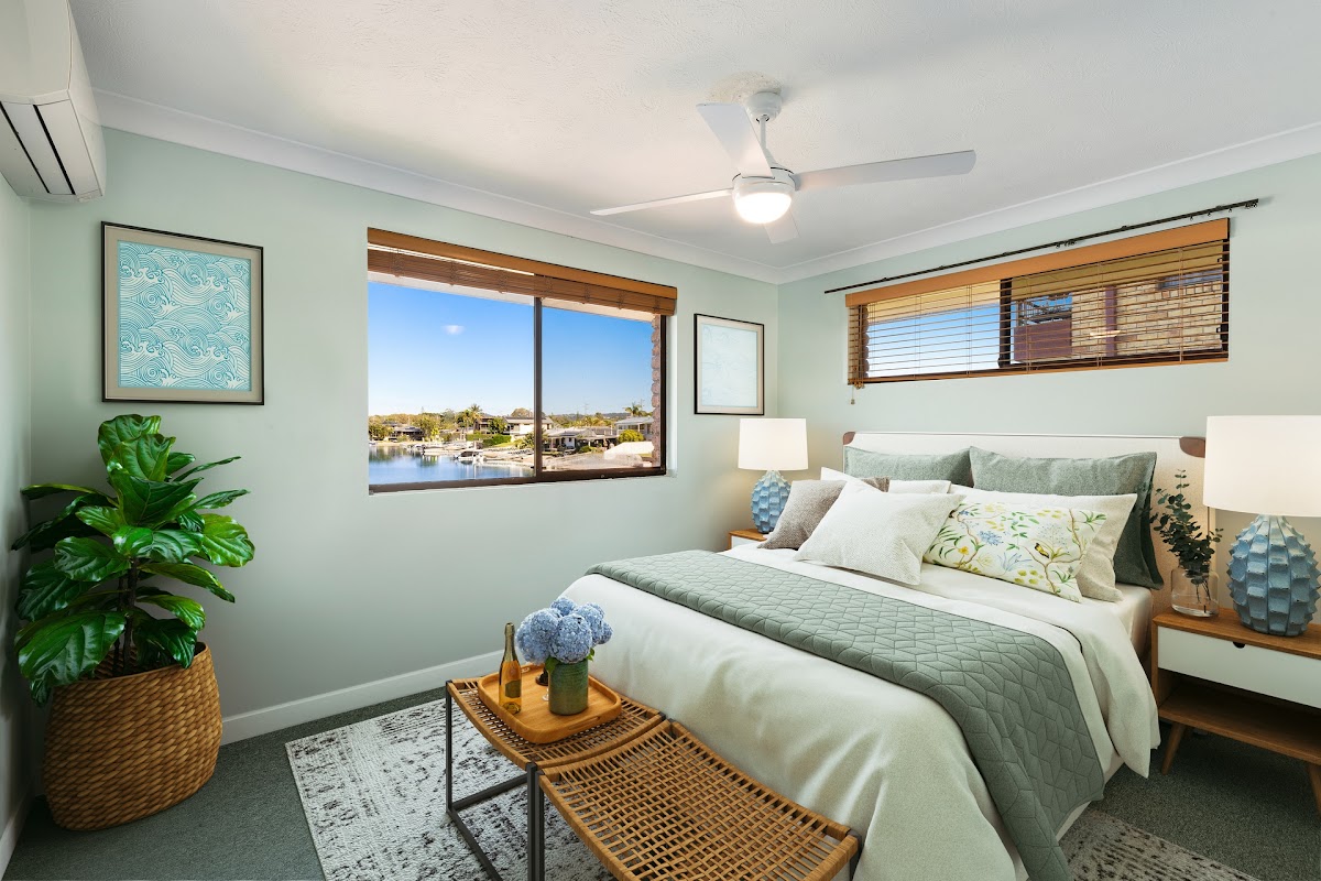 • The master bedroom has views of the water with built in mirror wardrobes, a fan, and air conditioning.