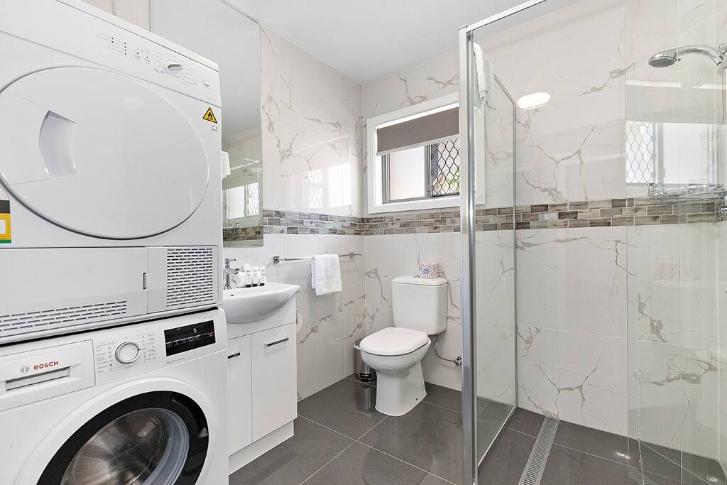 – A stylish bathroom including floor to ceiling tiles, a rainfall showerhead, a washing machine and a tumble dryer;