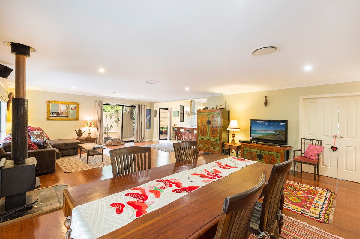 The garden is sunny and tropical with wonderful grassy fields. The orchard is very productive, with approx 25 varieties of fruit trees, so you could make your own preserves. There is even a chicken shed and enclosure – imagine your chooks clucking out those breakfast eggs! Enjoy cocktails and BBQ’s on the private decking, complete with birdsong, leafy views and serenity. Wildlife fans will swoon: there is even a fairy wren nest in the hanging pot plant!