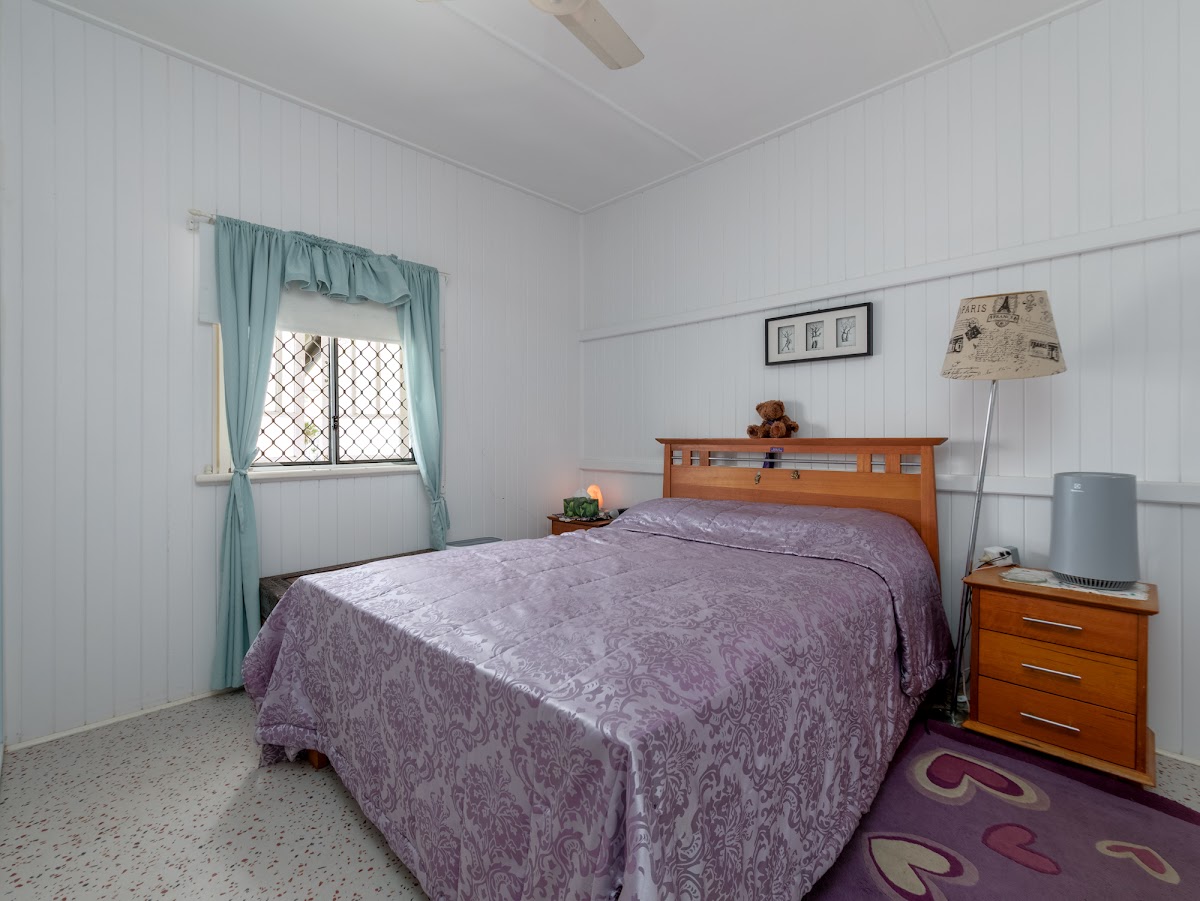 Inside, the home unfolds with classic Queenslander appeal. High ceilings, traditional glasswork, and oversized rooms create an inviting sense of scale and light throughout. Both bedrooms are impressively large, with Bed 1 featuring new lino flooring and air-conditioning, while Bed 2 includes built-in storage.