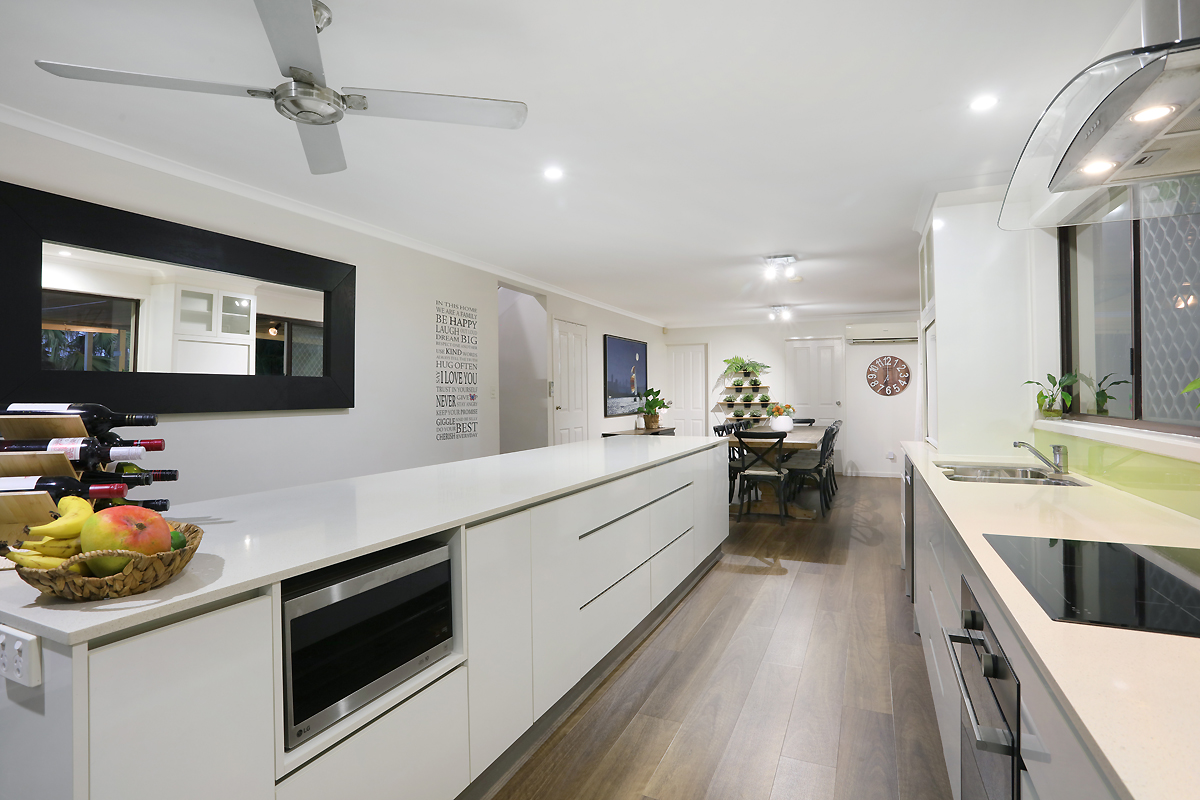 Entertainers kitchen with a 4.25m long x 900mm wide Caesarstone bench with a breakfast bar, inbuilt book shelves, appliance storage unit, glass splashback, a SMEG induction cooktop, a new BOSCH dishwasher, 3 door pantry with a light, lots of crisp white cabinetry, soft close drawers, a 960mm x 1.81mm fridge space, a double sink, a ceiling fan and overlooks the covered entertaining area through to the inground pool and 6 person Jacuzzi