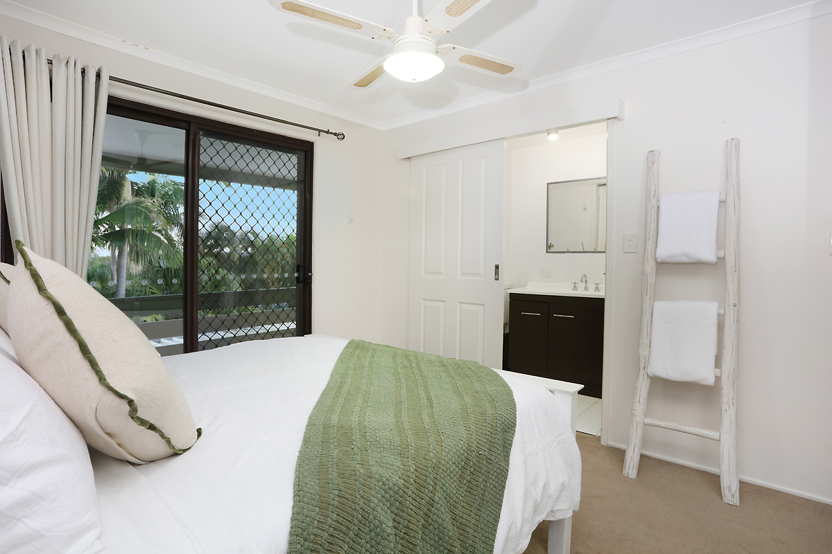 The master bedroom has a raked ceiling and imported swing Bali doors to the walk in robe adding a unique and exotic touch to this space