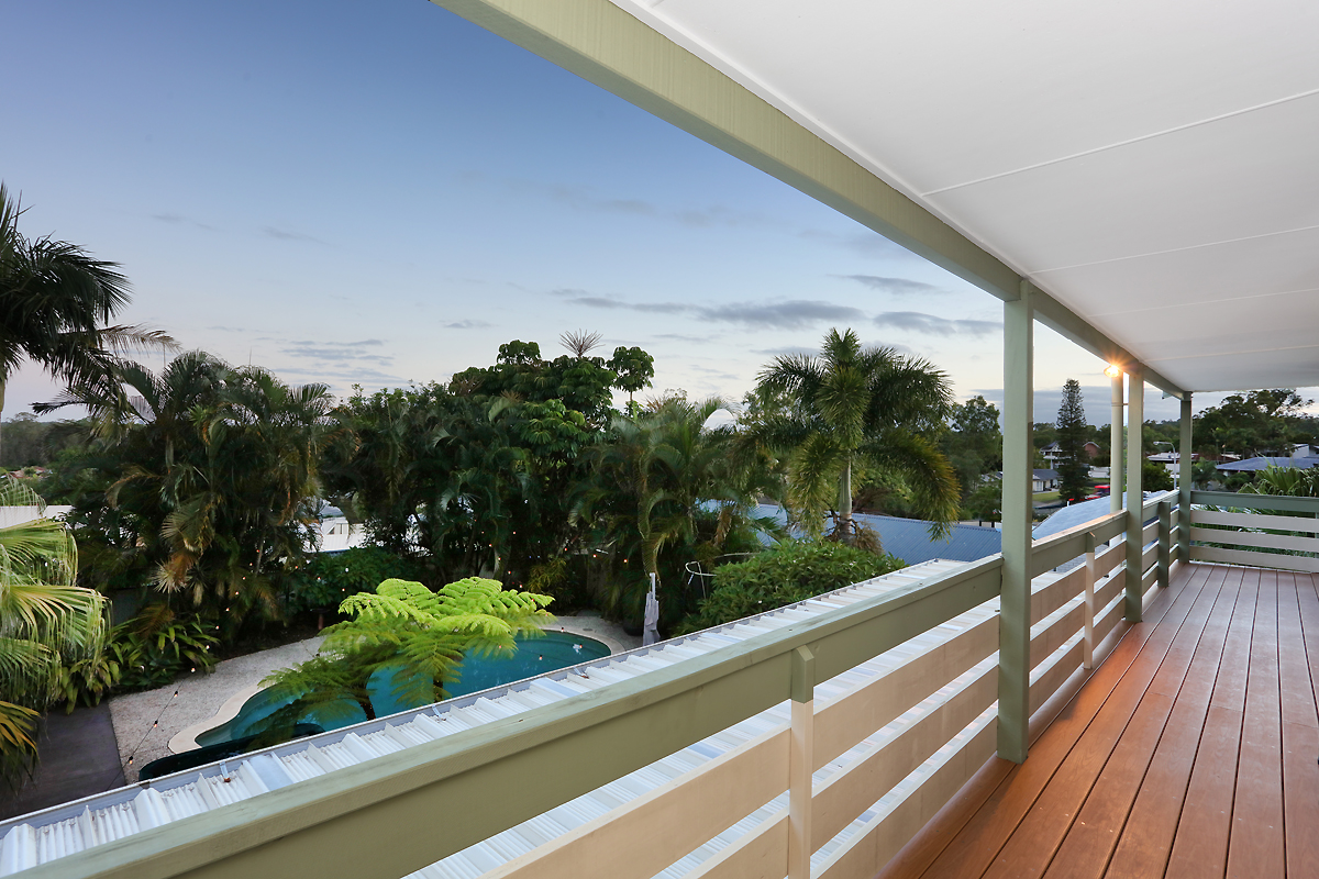 All upstairs bedrooms open out to a long balcony overlooking the pool and Bali Hut area and Gold Coast skyline views