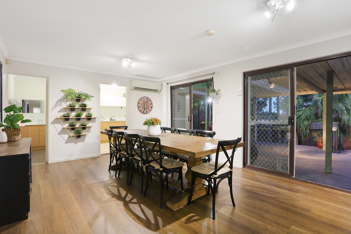 Spacious family/dining room with an aircon with 2 sets of sliding doors to the outdoor area allowing lots of natural light to flood the home