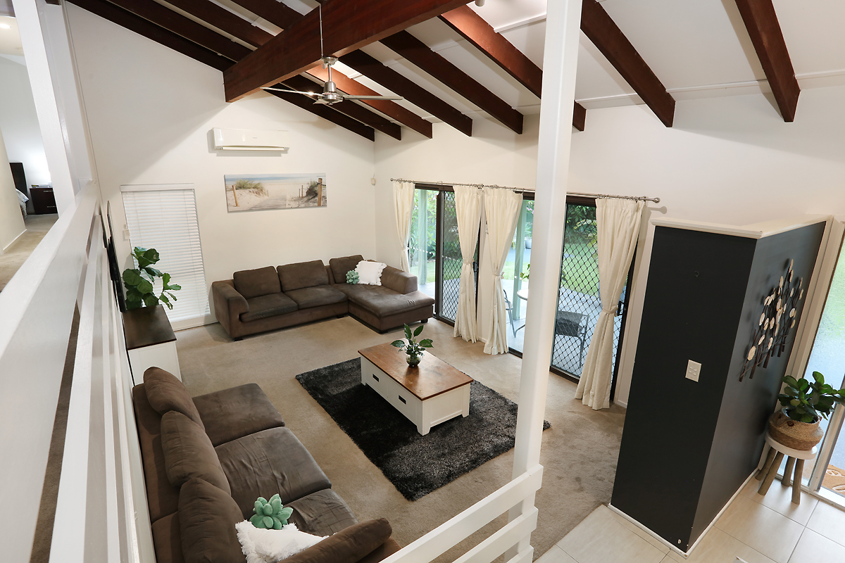 Lounge room with cathedral ceilings approx. 4.3m high with an air con