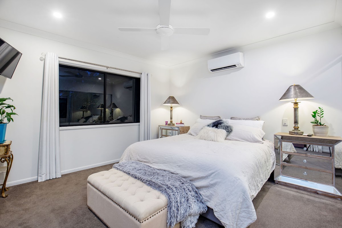 The lounge, with rear doors to a tranquil viewing deck, overlooks a tropical, tree topped vista with views through to the sparkling pool area below. Stay cool, even on the hottest days with a dip in the large landscaped pool surrounded by lush and tropical gardens. Lay back and listen to the running waterfall… an oasis in your own back yard.