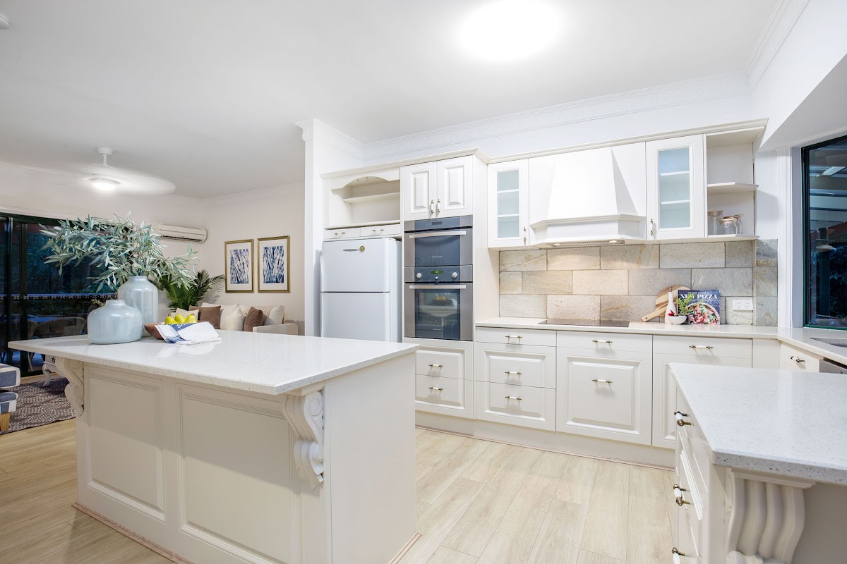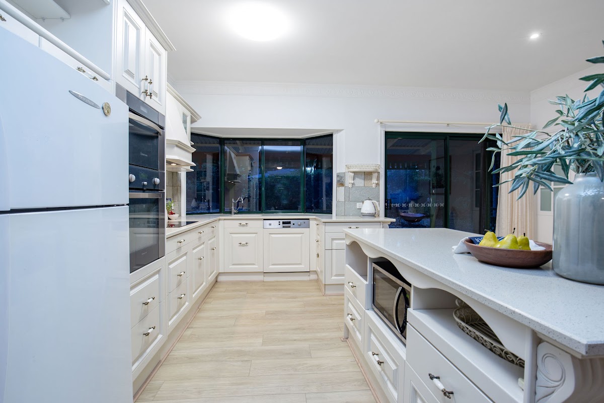 A country style kitchen with a glass door storage pantry, Kleenmaid appliances, Pyrolytic oven, stone work surfaces and tiled splashbacks ensures the chef in the home is well catered for!
