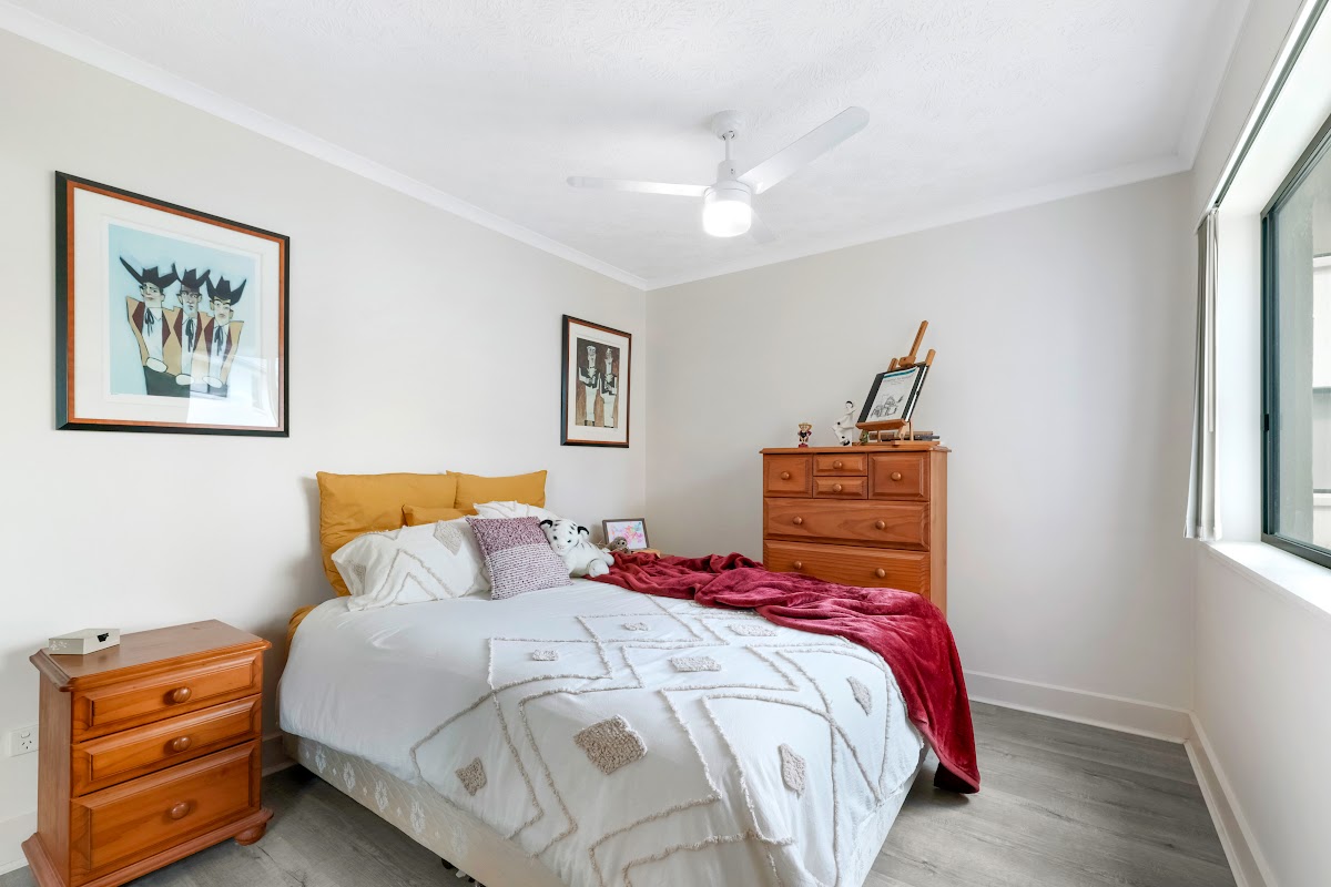 One spacious bedroom with mirrored robes is perfectly situated away from the living area at the end of the hallway, the perfect floorplan.