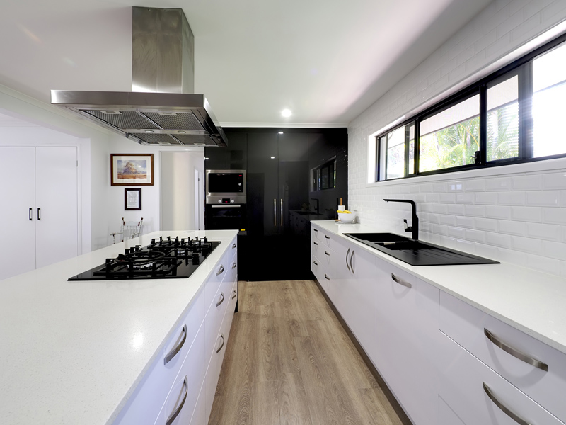 – Wow kitchen with centre placed gas 900mm cooktop and canopy rangehood. Two pac doors and drawer with soft close feature, black sink and tapware set this stunner off. The stone benchtops finish the high end luxury chefs kitchen.