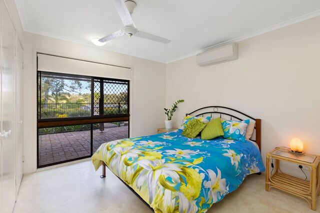 The main bedroom features ensuite and walk-through robe, and all bedrooms include air-con, fans and built-ins.