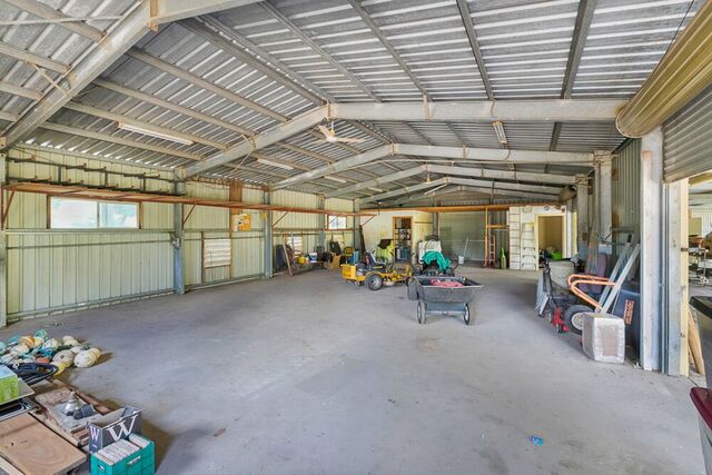 The shed features 3-phase power, very high ceilings, multiple access doors and capacity for dozens of vehicles.