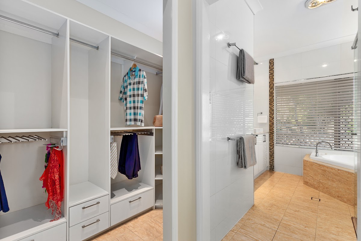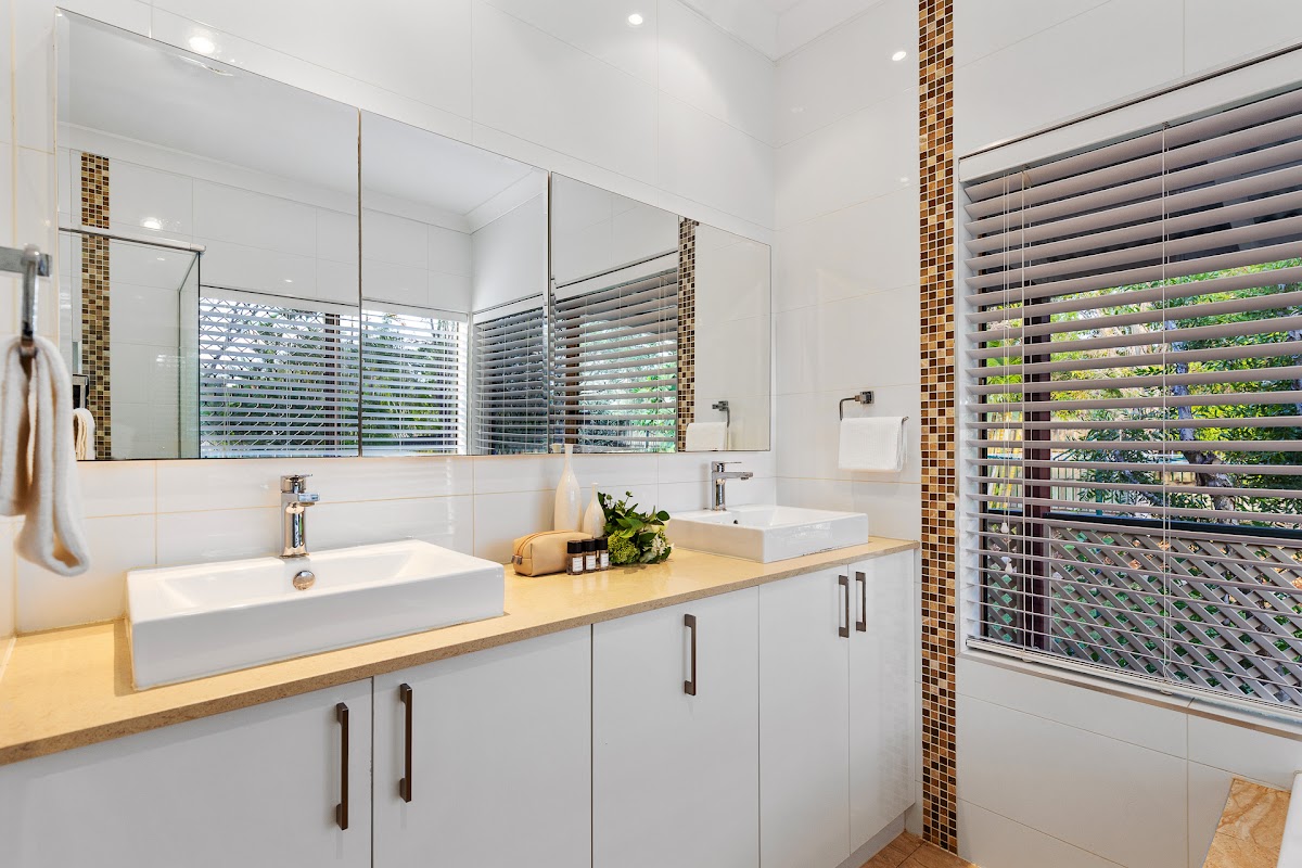 * Large parents oasis offering a massive master suite with large walk in robe with a modern fitout, a stylishly renovated ensuite with large corner spa bath, his & hers stone bench vanity, a beautiful bay window with a tranquil outlook & its own private access door out to the deck