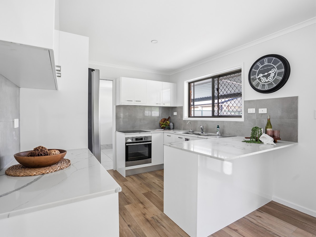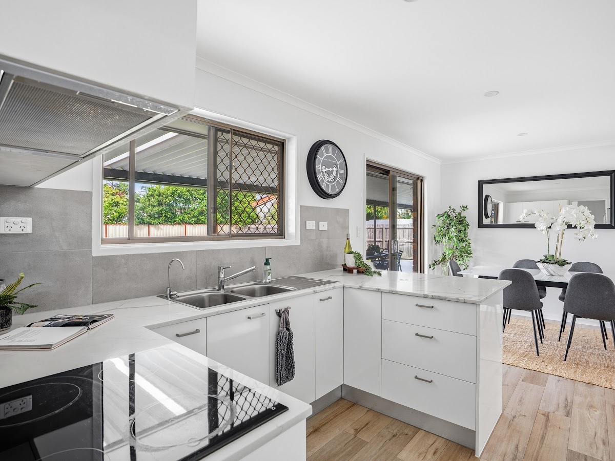 Perched proudly at the top of the street, this fully renovated home captures both elevation and privacy, making it a standout opportunity in the area. The home has been thoughtfully updated throughout, featuring four generously sized bedrooms, all complete with air conditioning, ceiling fans and built in wardrobes. The converted garage now serves as a spacious fourth bedroom with a built in study and additional storage, perfect for those working from home. Inside, you are welcomed by beautiful timber flooring, a fresh repaint and a well designed layout that offers both comfort and functionality. The kitchen is a true highlight, finished with stunning stone benchtops, a U shaped design and a breakfast bar, seamlessly flowing to the expansive outdoor entertaining area complete with its own kitchenette. Set on a 650sqm + block, this home is move in ready and designed for easy living.