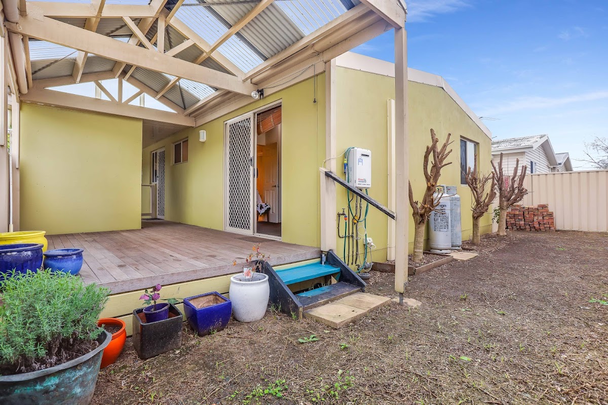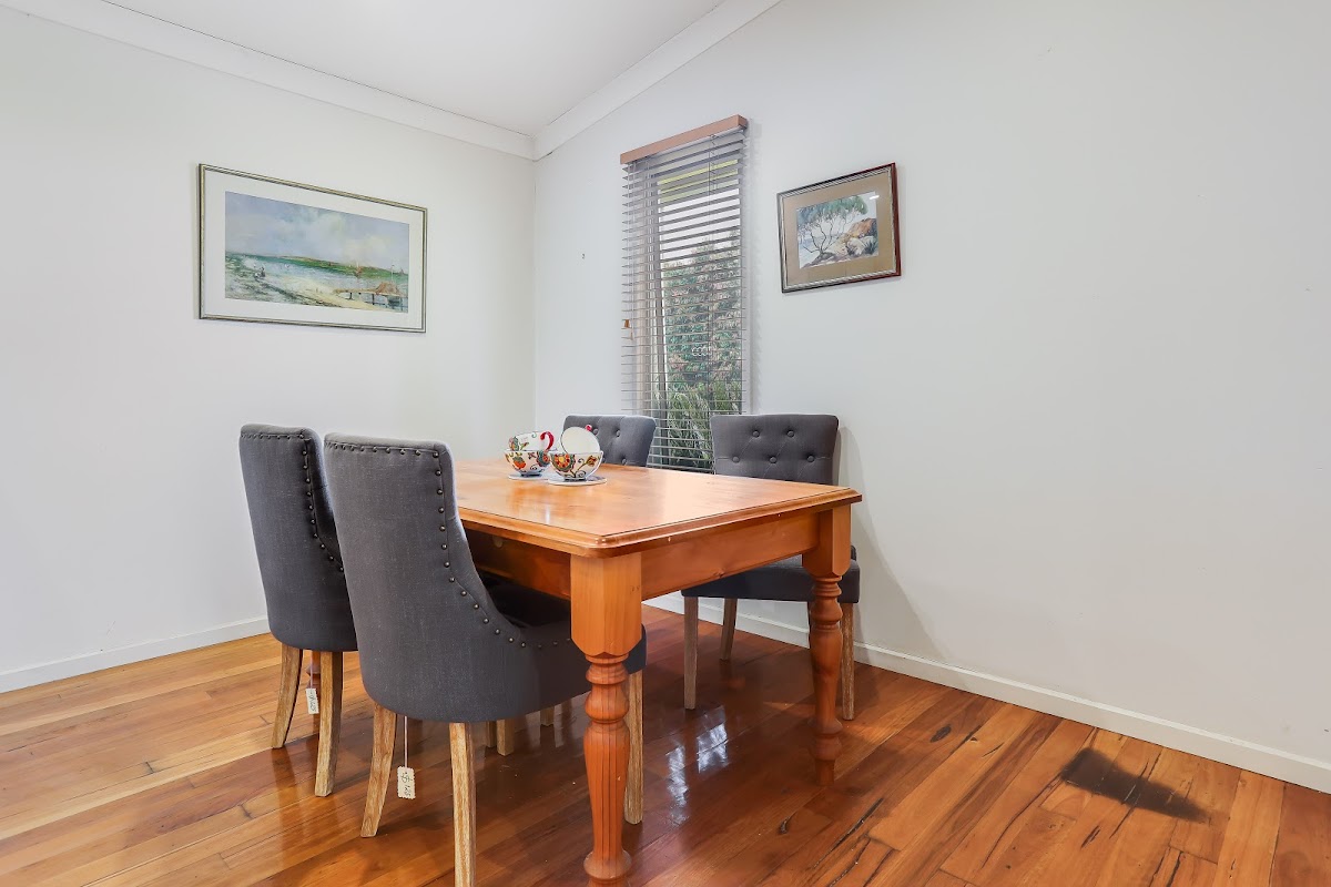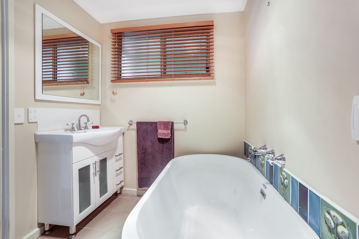 Sliding doors from a master bedroom open onto a deck and wraparound backyard providing a peaceful place to relax and unwind. The bathroom with freestanding bath provides dual access and two more bedrooms with built-in robes.
