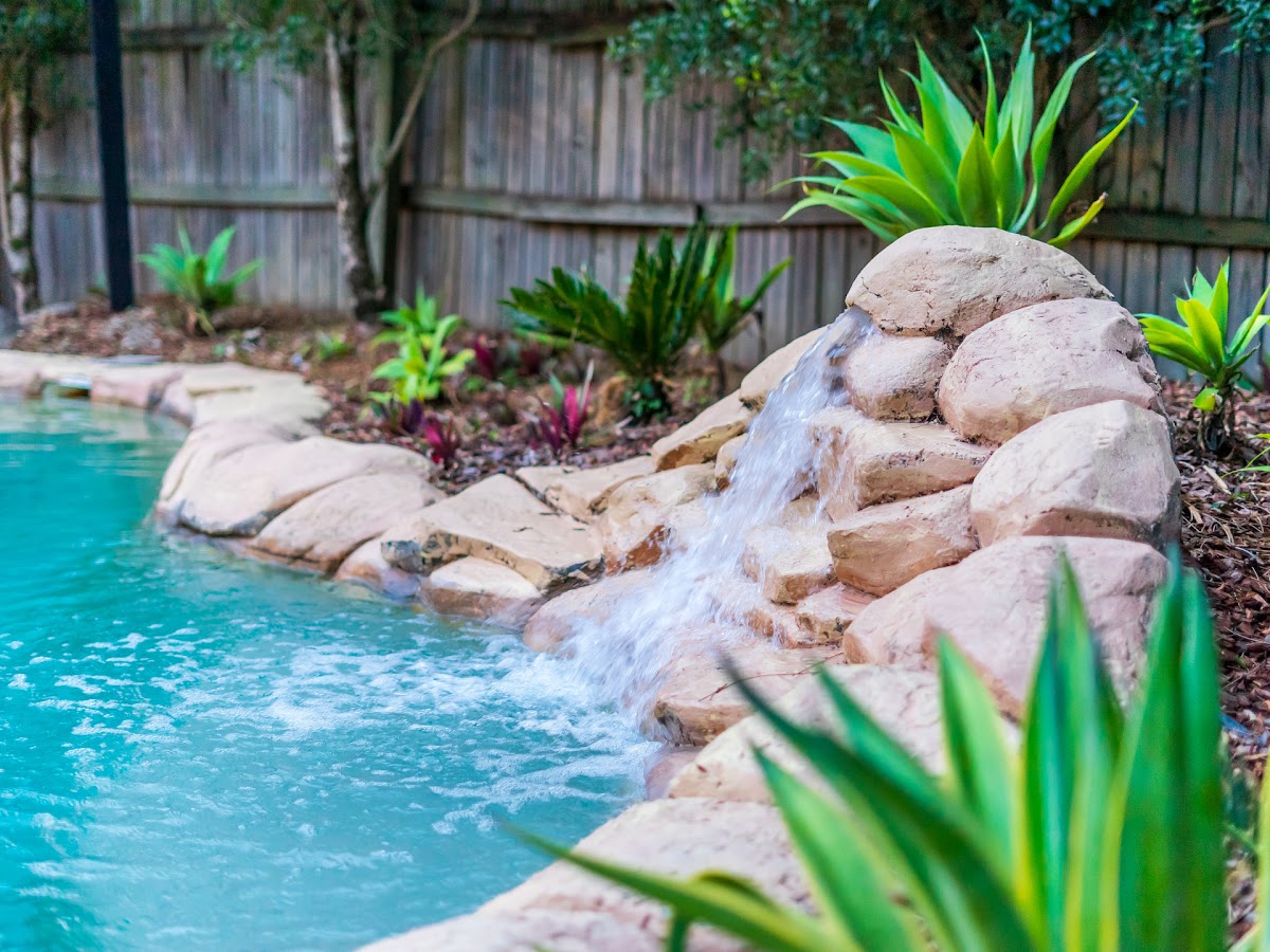 Sparkling pool with water feature, tropical planting and glass fencing.
