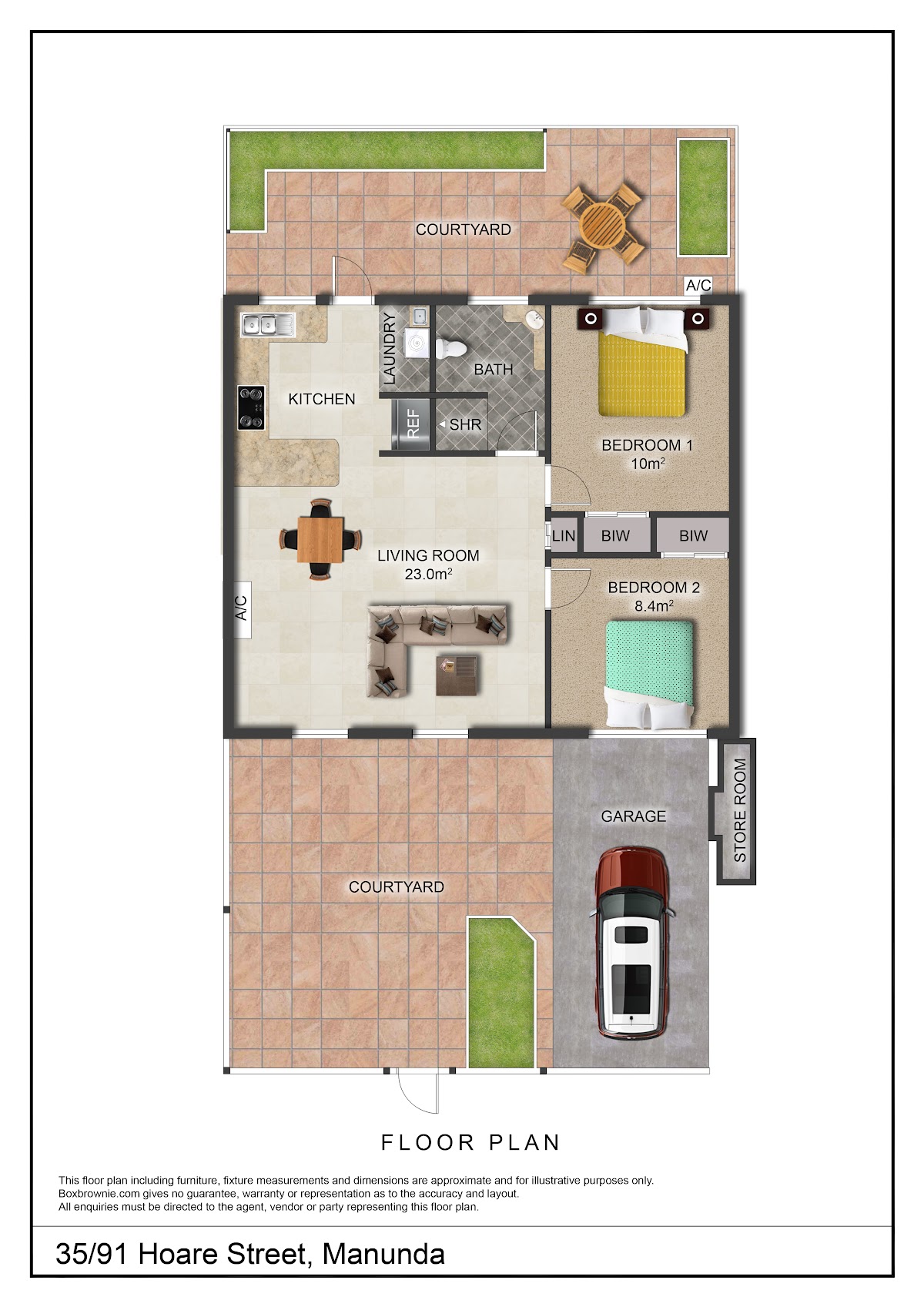 Superbly positioned just a short stroll to shops, medical, café, schools, gym and transport, this spacious single level property feels like you are in a house not a unit as it is attached to only one other unit. Surrounded by pleasing lawns and gardens, boasting a sunny east facing courtyard with picturesque garden aspects, ideal for those looking to downsize or as an entry to a central, convenient location, with excellent potential to modernise. A good-sized living/dining area flows out to a second very generous airy enclosed west facing courtyard perfect for a pet or the potting gardener. Offering central kitchen, two bedrooms both with built in wardrobes and bathroom with shower. Complete with aircons, fans, security screens and single lock up garage with storage room. The home is conveniently located only a 7 minute drive to the CBD.