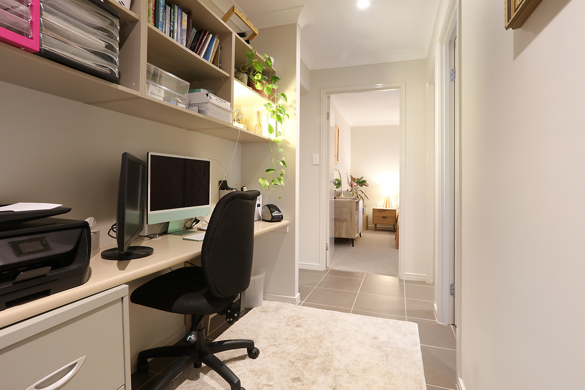 A well proportioned study nook featuring a long built in bench and practical overhead shelving – a smart stylish space for work or creativity