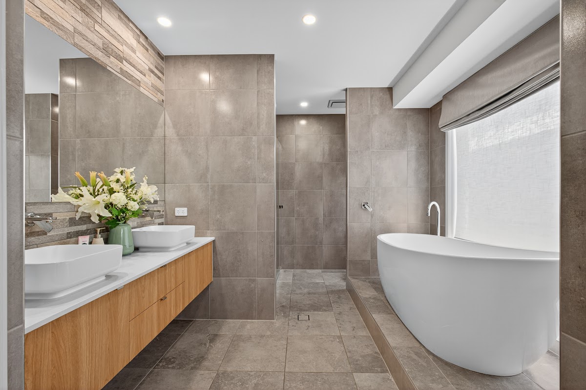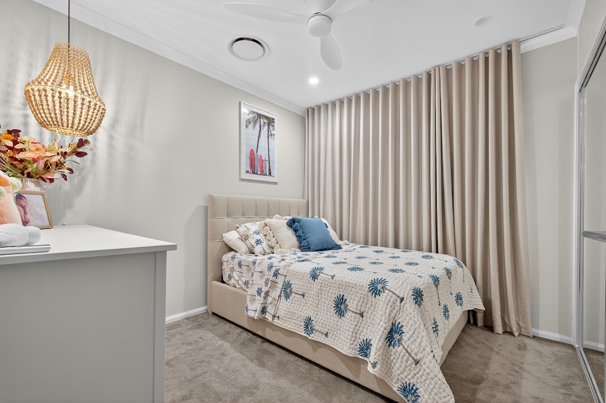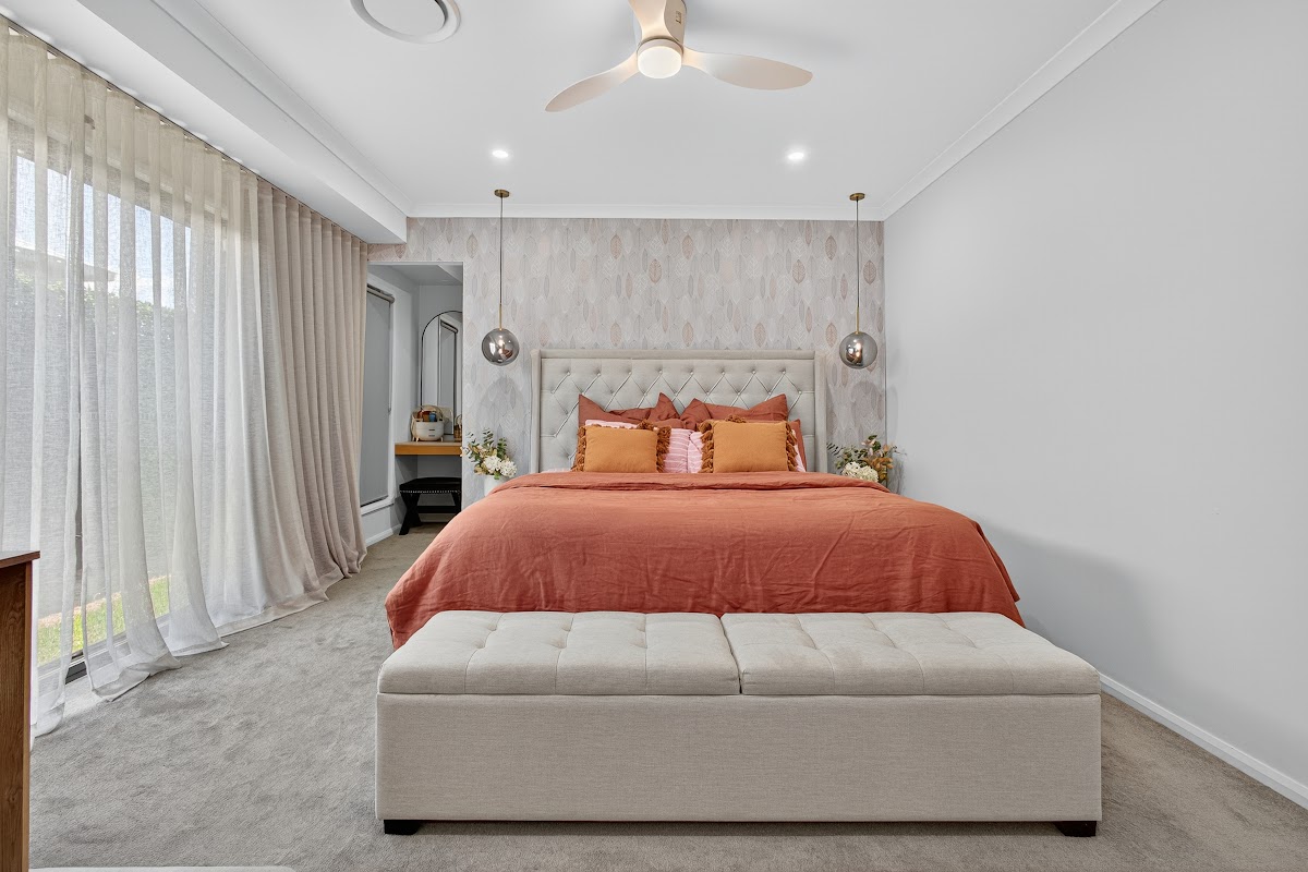 The master suite offers a true retreat, complete with ducted air conditioning, a spacious open plan ensuite boasting dual vanities, a freestanding bath, and a large glass window with privacy screening. Three additional bedrooms each feature ceiling fans, plush carpets, built-in wardrobes, and soft natural light — ideal for family or guests.