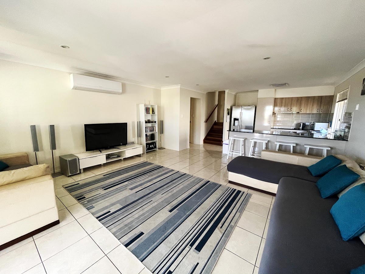 In the lounge room, there is an air conditioner in lounge with a horse-shoe shaped kitchen benches. Stainless steel faced under bench oven with ceramic cooktop.
