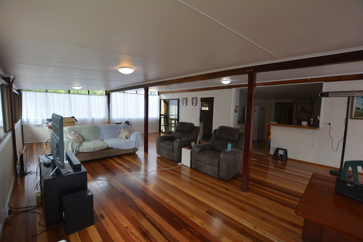 The bedrooms are located on either side of the central hallway into the home. The large dining/living area is displaying a beautiful, newly polished wooden floor. Wall to wall windows, seemingly merging the indoor to the outdoors, make the living room the place to be. The kitchen is nestled conveniently in the Centre of the home, overlooking the living area.