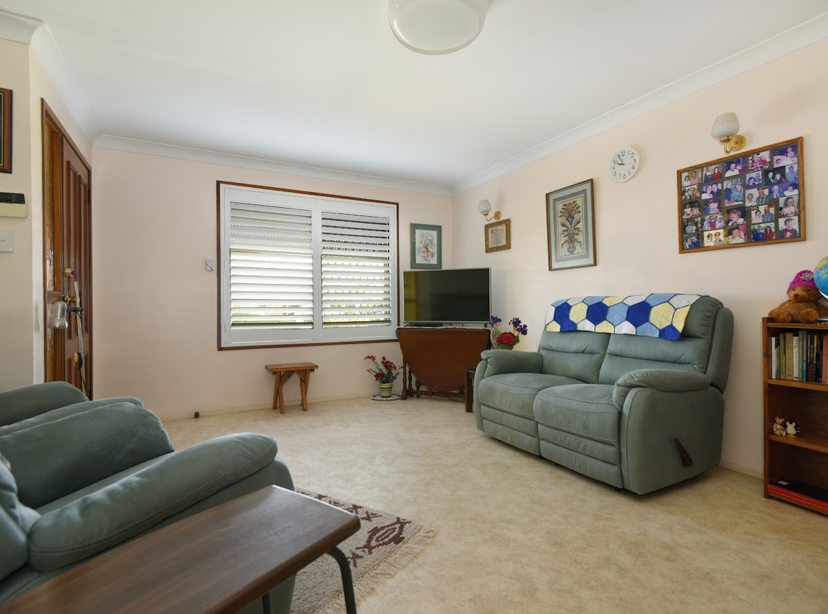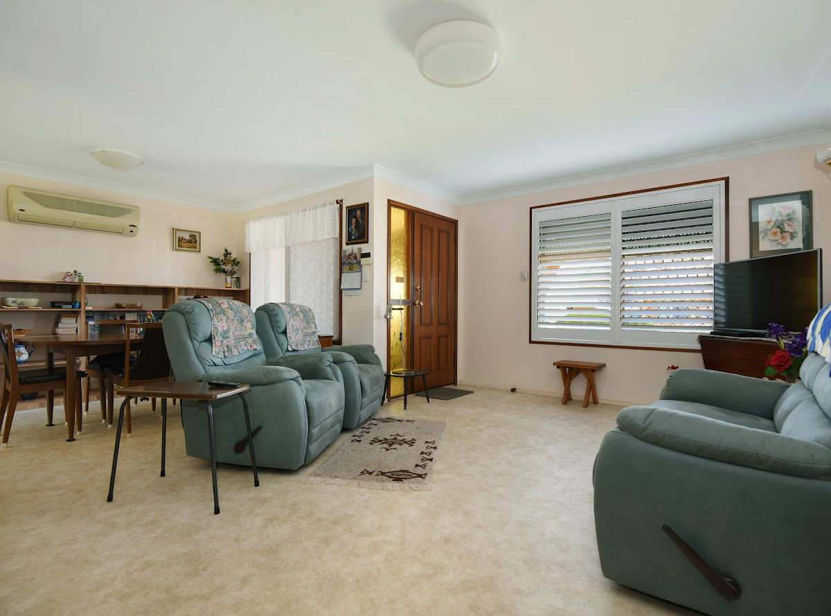 Inside, the house boasts a spacious living area with a built-in study and built-in wardrobes. The living area is bright and airy, with natural light streaming in through the windows. The bedrooms are generous in size and feature plenty of storage. The bathroom is modern and functional, with stylish fixtures and fittings.