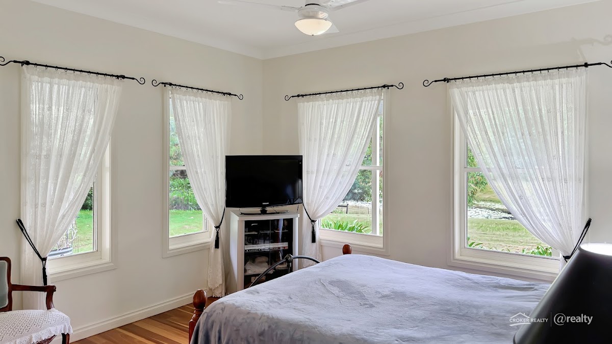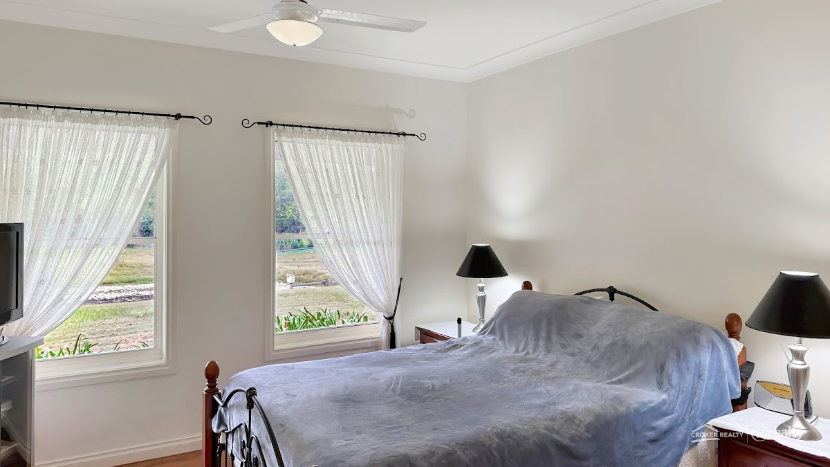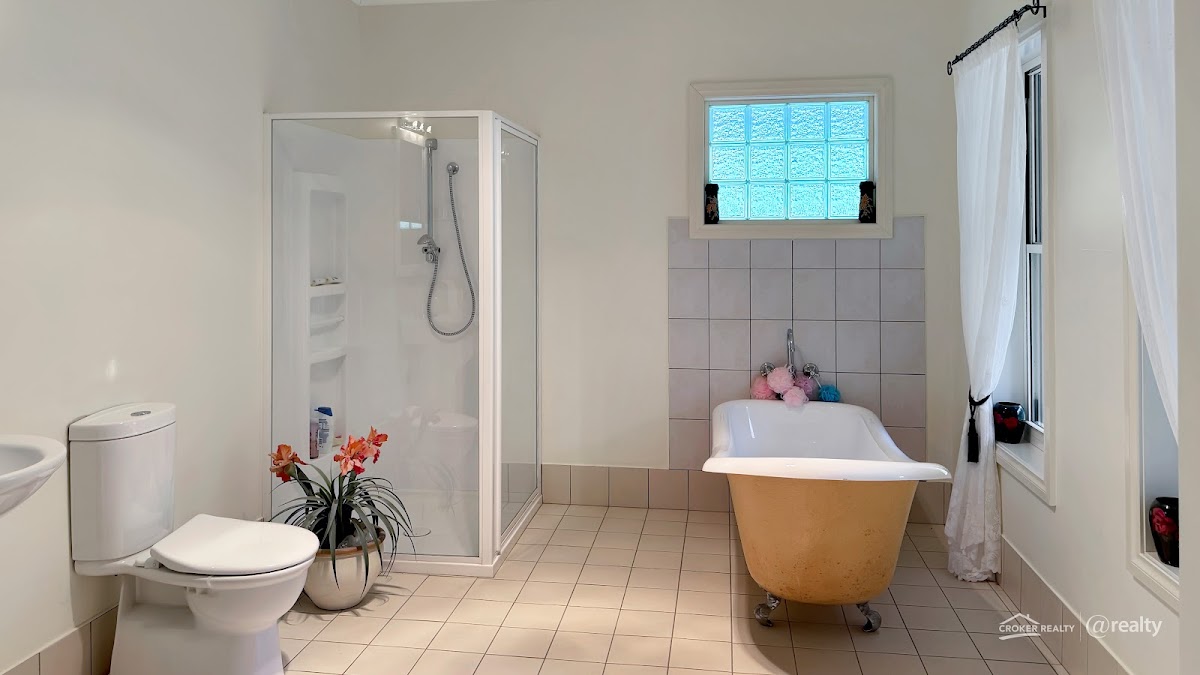 The main bathroom has a large bath and separate shower. Laundry has access to back veranda; in addition, a drying room adds a practical touch to this already impressive home.