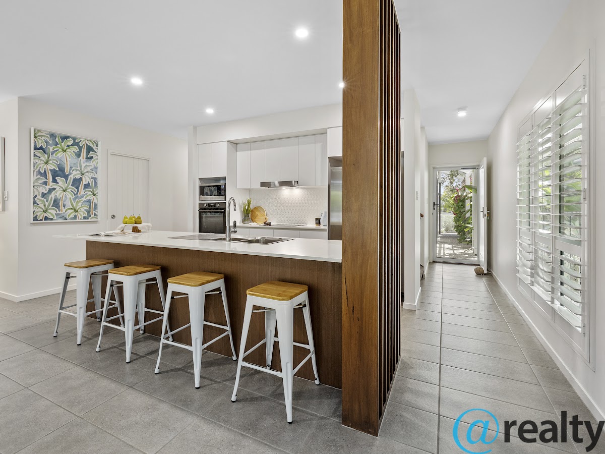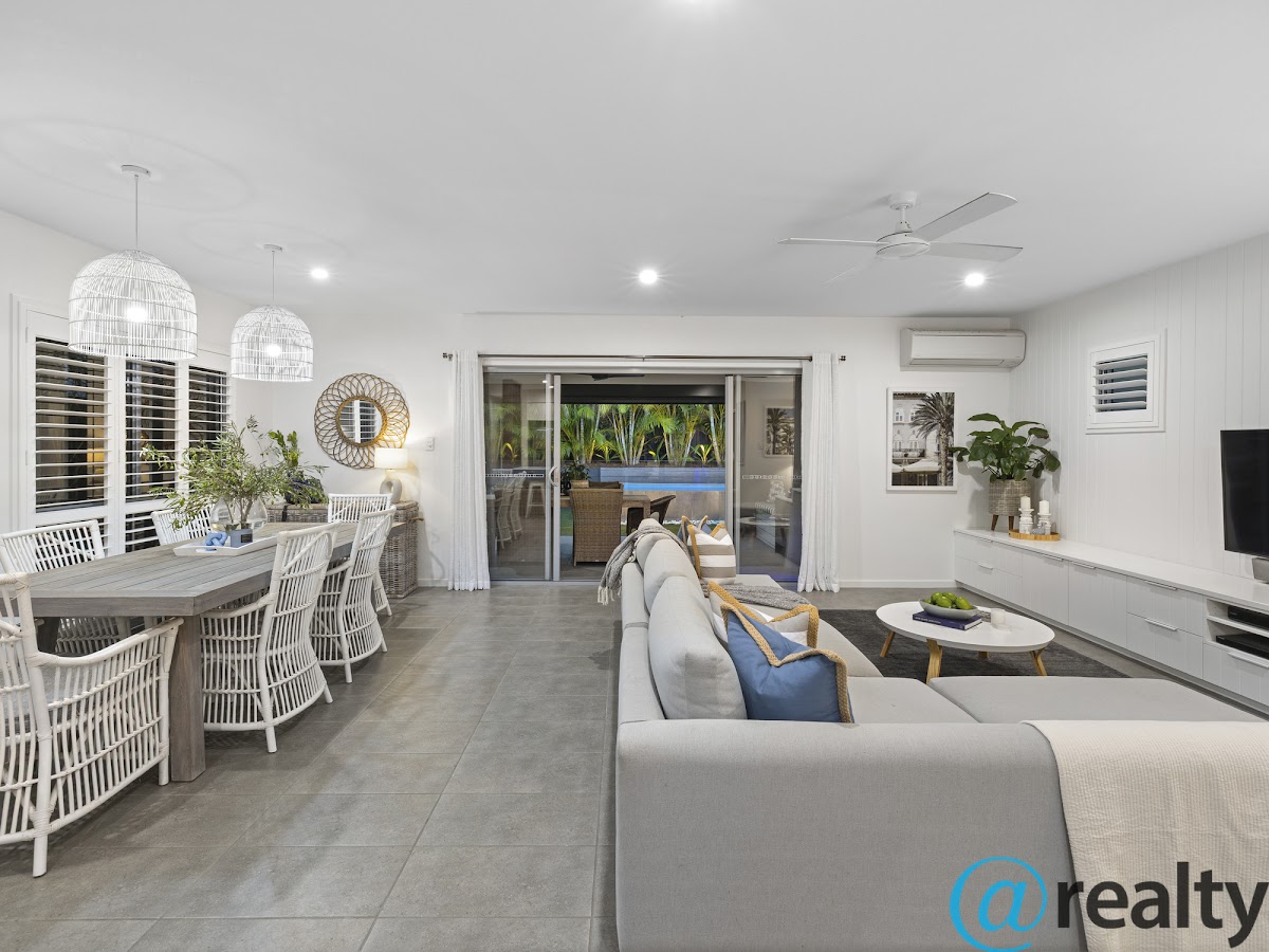 The open plan kitchen is the heart of this home flowing seamlessly out to the leafy rear yard and plunge pool . The kitchen features a spacious walk in pantry ideal for storage and additional appliances . Enclosed with shutters for privacy and light control the living room is gifted with a 5.5 metre custom built media unit for all forms of entertainment , with extensive storage space , ceiling fan and AC.