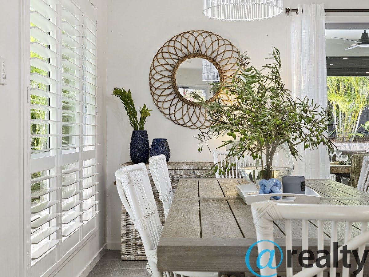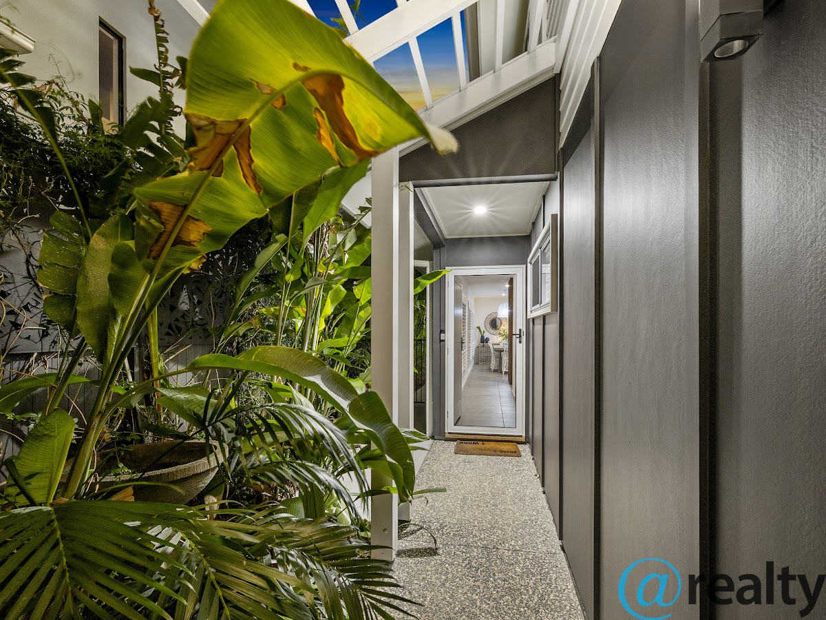 The rear entertainment alfresco room and outdoor kitchen area can be enclosed with the zip blinds to cater for all weather conditions. The Plungie pool set amongst the palms is partially set into the ground and accessed via the timber deck. It’s the perfect cooldown pool for those salty after beach visits.