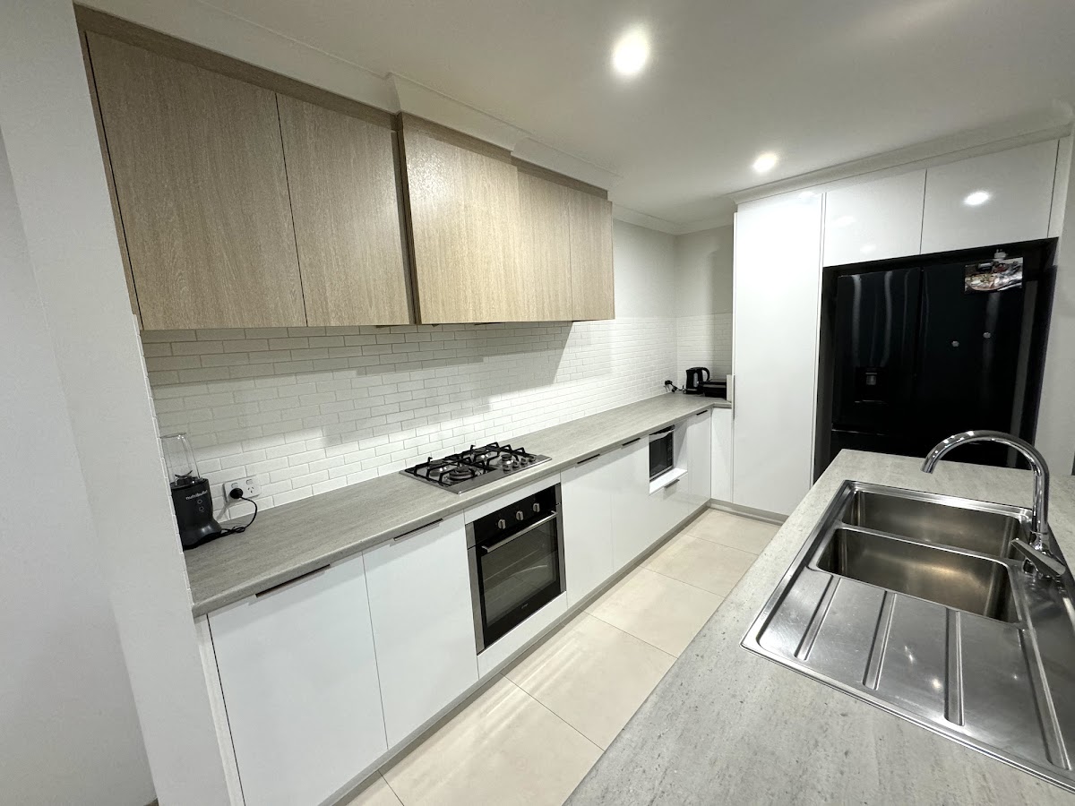 Galley kitchen with stone bench top and double sinks