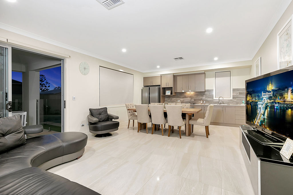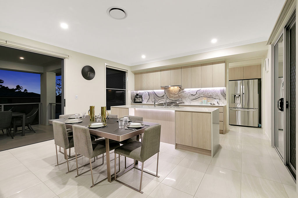 The kitchen makes a dramatic statement in luxury and practicality, boasting thick stone waterfall benches, beautiful pendant down lights, slimline soft close drawers and a complete range of premium appliances,the butler’s pantry provides an abundance of storage.
