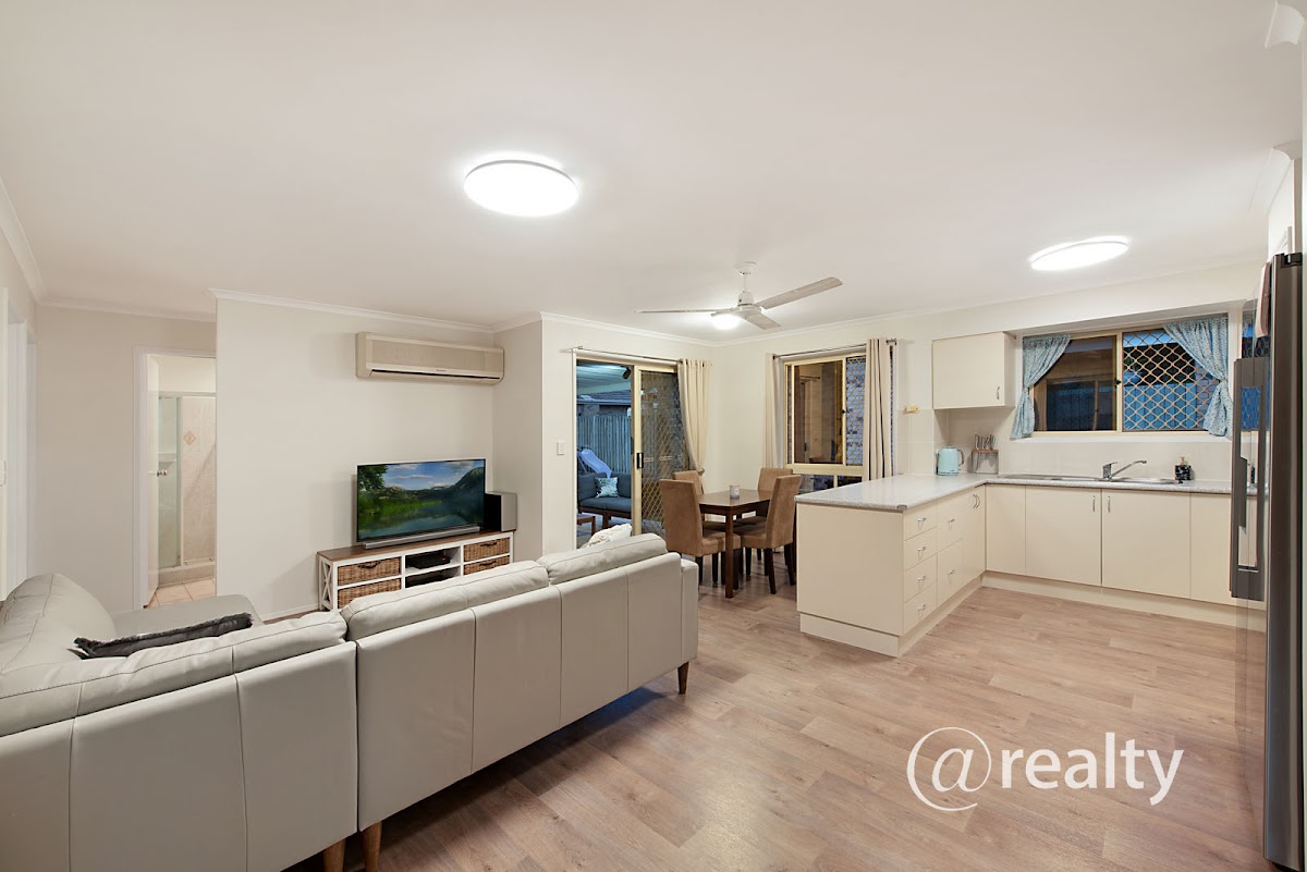The home offers a spacious open plan living & dining expanse and a spick & span kitchen with large work bench.