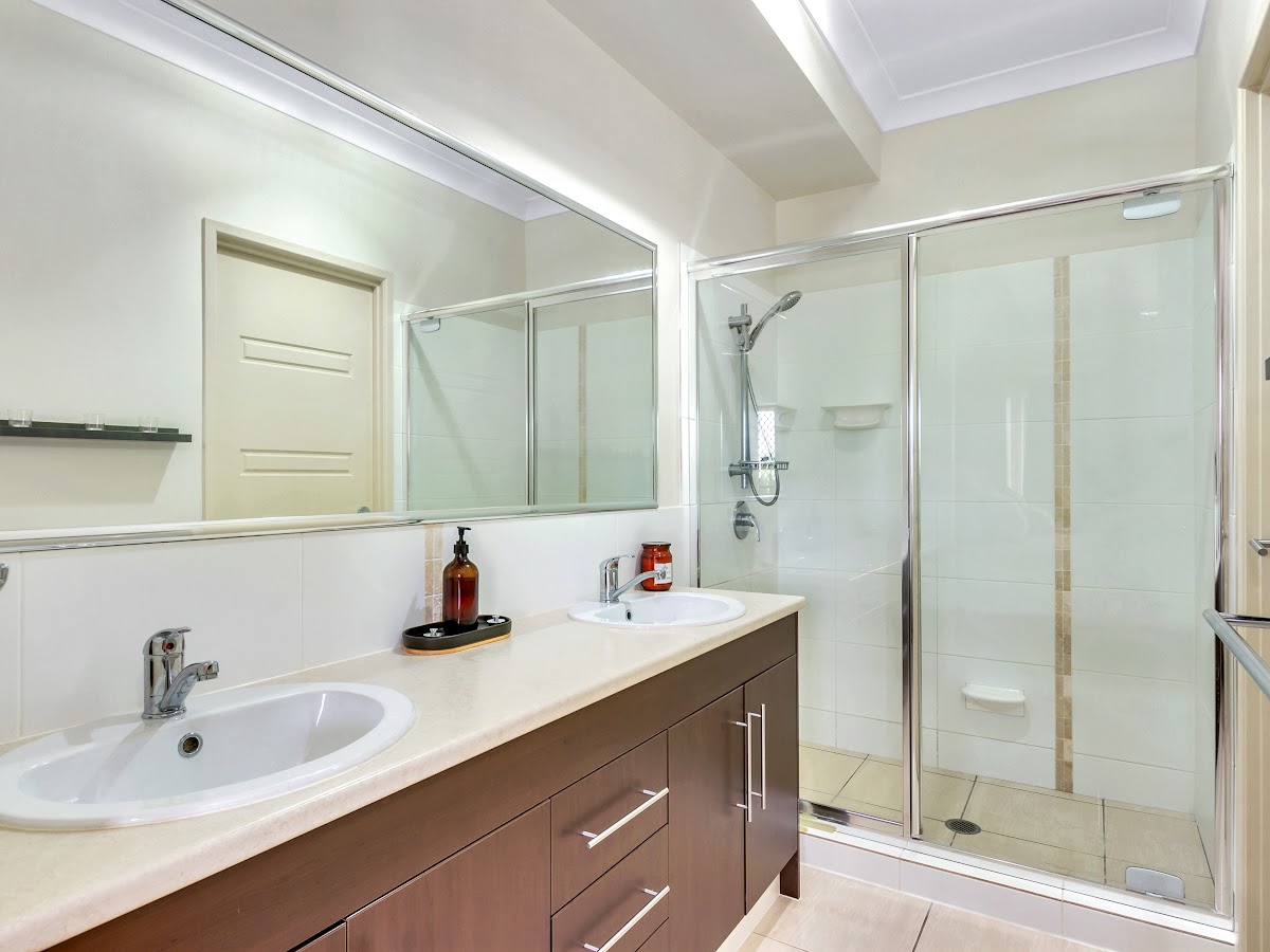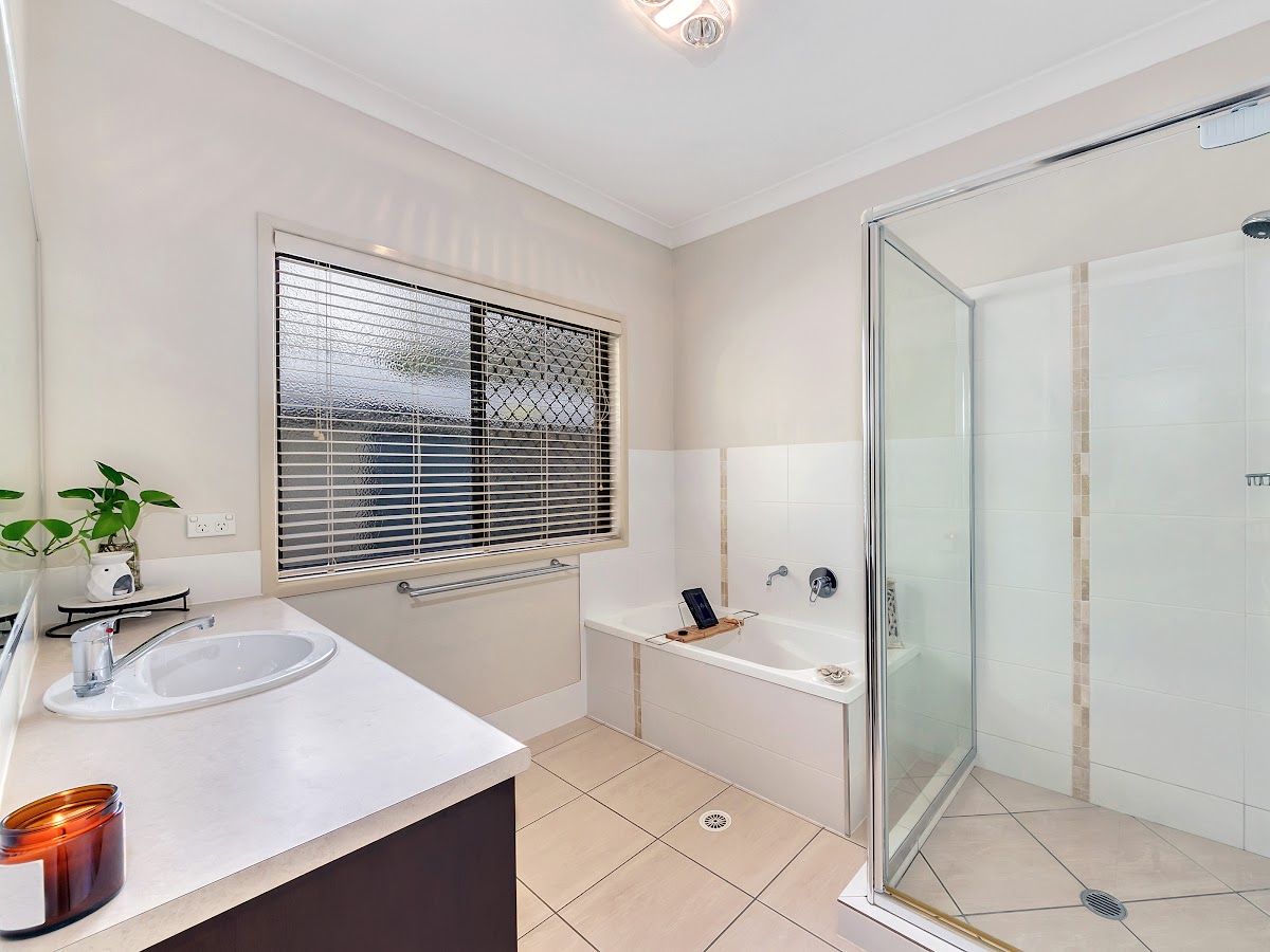 The main bathroom provides a separate shower, bath and vanity whilst there’s a separate toilet with its own external vanity.