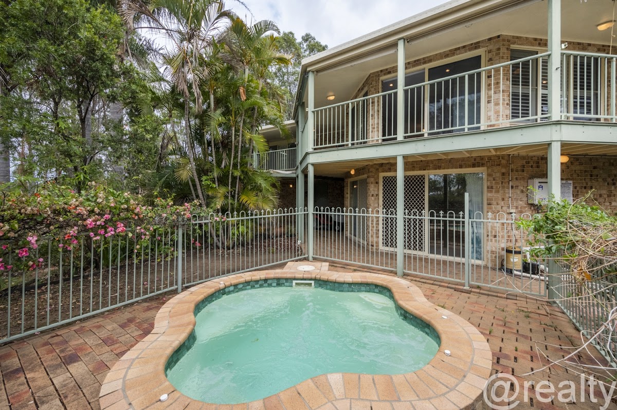 • The lower level offers a view over the spa into the garden area. The concreted area wrapping around the home is protected from the elements offering added space for a car or pursuits. There is an additional storage room alongside.