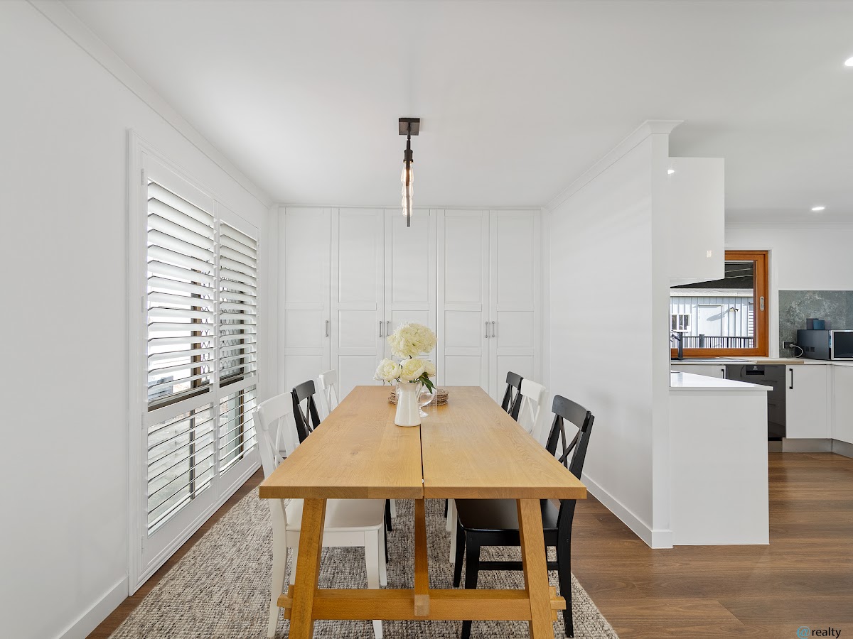 The renovated home includes spacious living and dining areas that flow seamlessly outside.