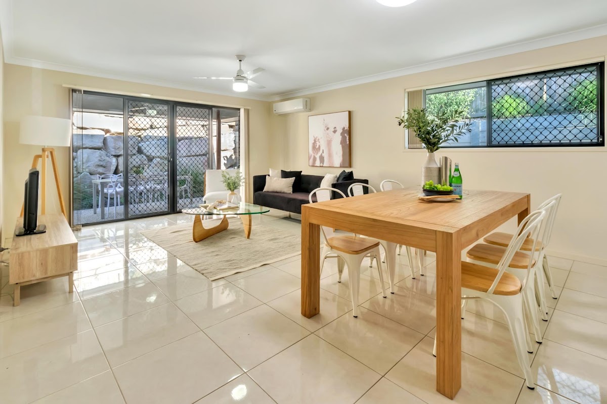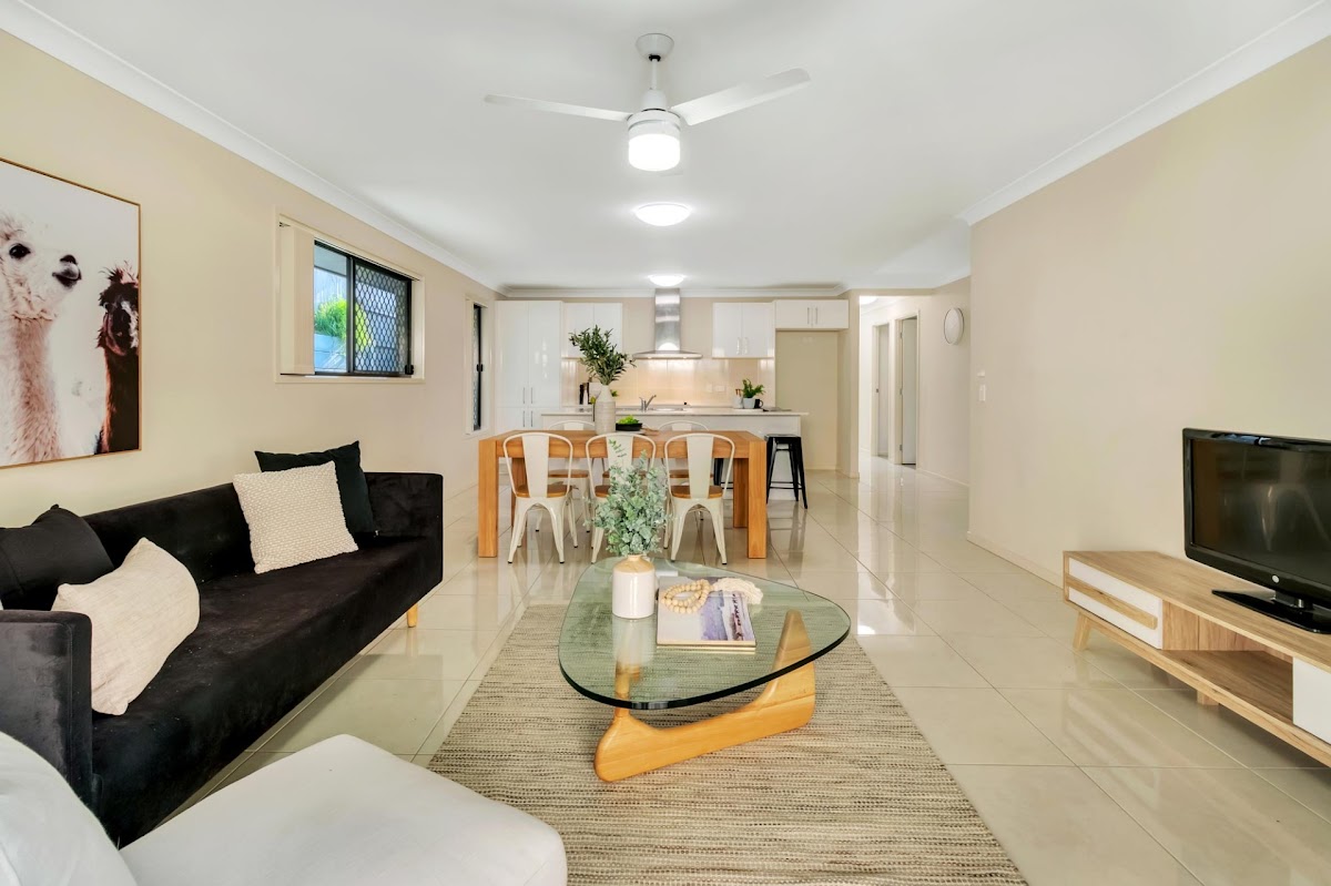 A well thought out floor plan which is unique to the area has the formal lounge found at the front of the house with the master bedroom located at the rear. The ultra modern kitchen has room to move and comes equip with soft close cabinetry that has a high gloss finish, a convenient Cesar stone topped island bench providing that essential additional space, seating and storage and quality stainless steel appliances. The main living and dining area is a huge open space, fully tiled and air conditioned with double sliding doors that lead out to an exceptional covered alfresco area that is very private with lighting and ceiling fan.