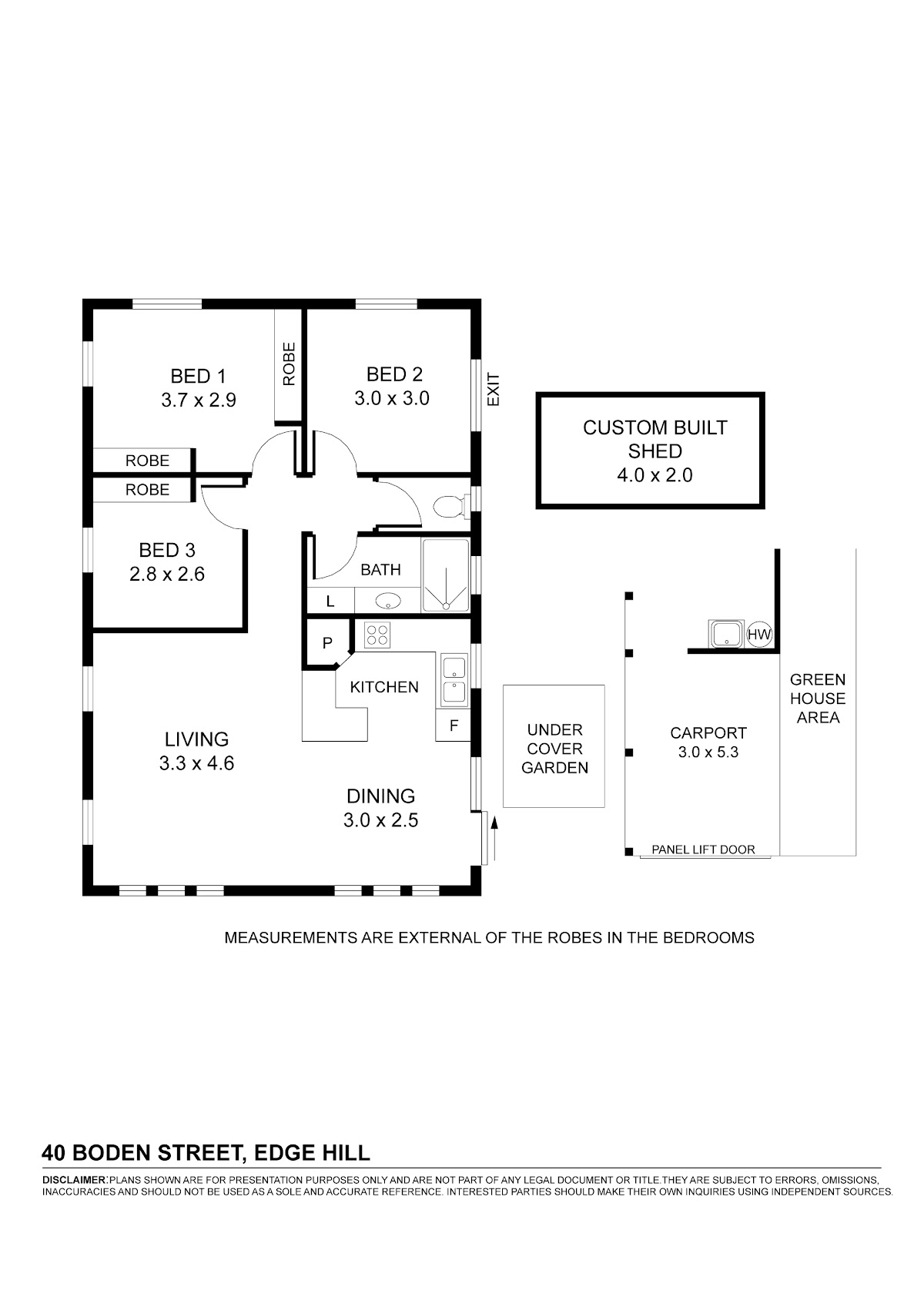 Outside is a new fence, almost all way round, a custom built 4x2m shed, external laundry and car port. Extra greenhouse area down the side of the garage for storage or planting area.