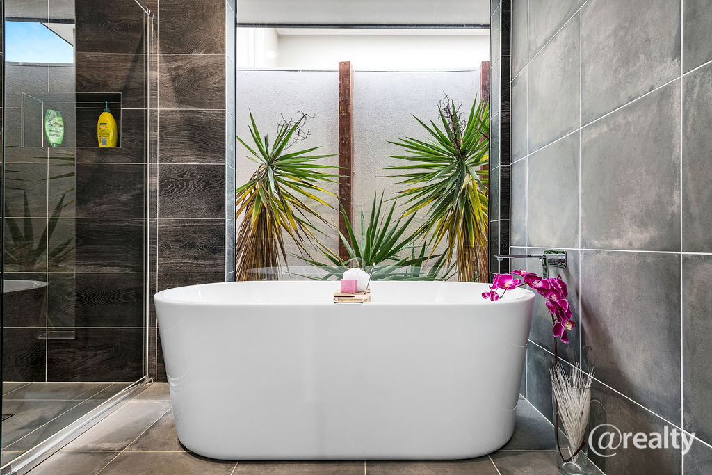 – Luxurious bathroom tiled from floor to ceiling with a deep set freestanding bathtub in a relaxing setting