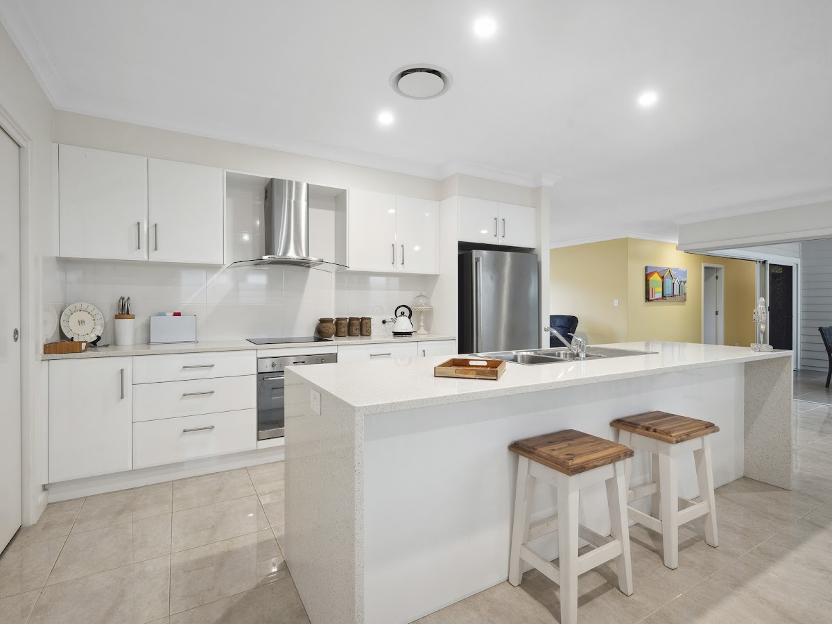 The home features three spacious bedrooms, including a luxurious master suite with its own private ensuite and walk-in wardrobe, ensuring comfort and privacy. The versatile layout includes multiple living areas, perfect for modern family life. The gourmet kitchen is a chef’s delight, equipped with Smeg appliances, ample storage, elegant stone benchtops, and seamlessly connected to the living spaces. Open up the glass stacker doors to your outdoor entertaining area and the home becomes an expansive layout, ideal for hosting special occasions with friends and family.