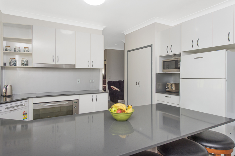 * NEW kitchen with soft close drawers, stone benchtop, stainless steel electric oven and rangehood, 4 burner adjustable size cooktop, family dishwasher, glass splashback, breakfast bar, microwave and fridge recesses, breakfast appliance nook.