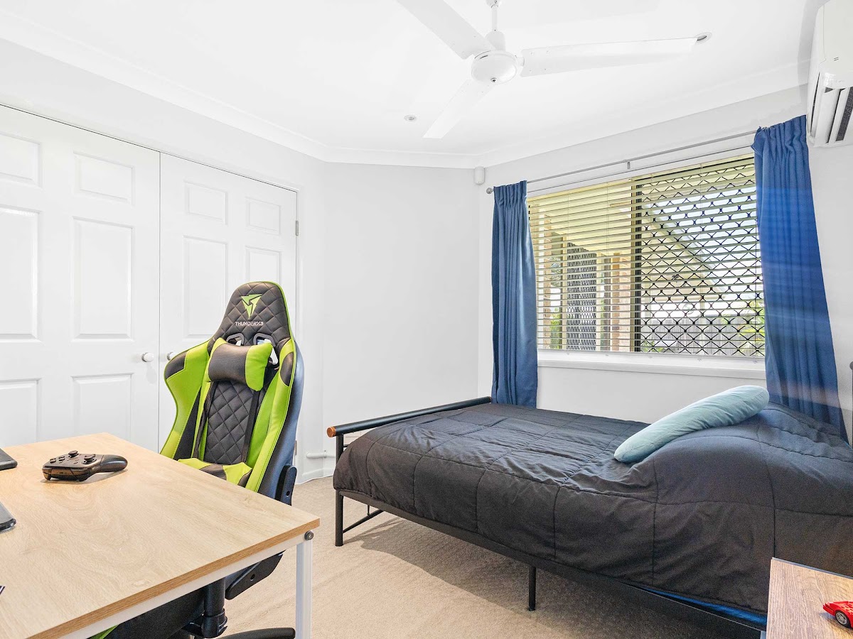 The air-conditioned “master-suite” at the rear of the home, looks out over the yard and pool area, and has a luxuriously renovated modern ensuite and large walk-in robe. The 3 kids’ bedrooms all have air-conditioning, spacious built-in robes and ceiling fans. Bedroom 3 (4m x 3m) has also been fitted with an easy fold-down ladder system up to a great storage loft, with pitched walls (all lined) and lighting – the kids will all want this room! The spacious main bathroom and renovated modern laundry are adjacent to these bedrooms. The large study, which is big enough for 2-3 desks or workstations, is at the front of the home and is next to the kitchen, so that you can supervise the kid’s study and internet time quite easily!