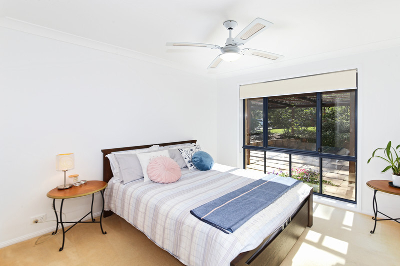 The ample master bedroom features walk-through robe, en-suite and has reverse cycle air-conditioning. Full length windows in all bedrooms allow light and nature into the home, with the surrounding gardens ensuring total privacy. All bedrooms have built in robes and ceiling fans with air-conditioning in another bedroom.
