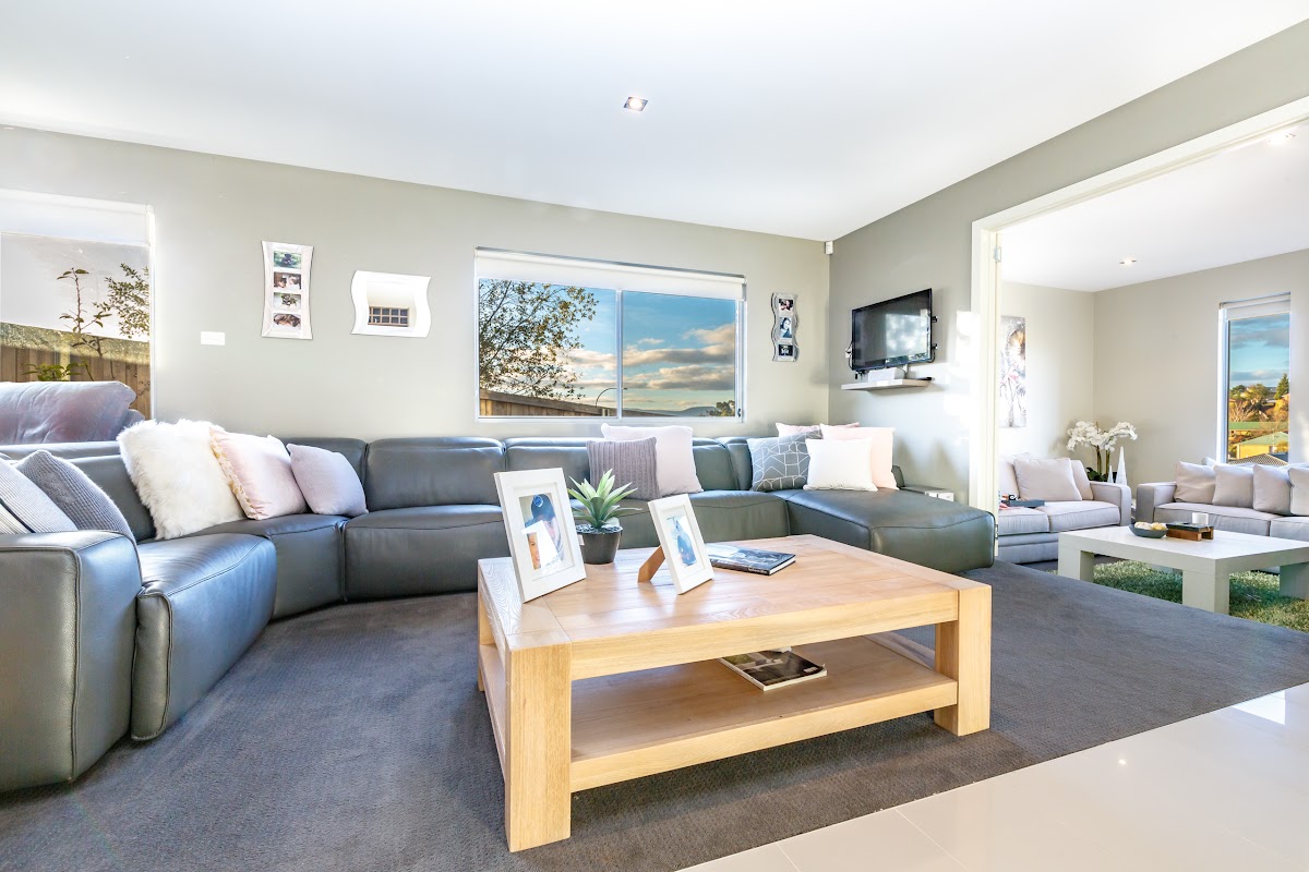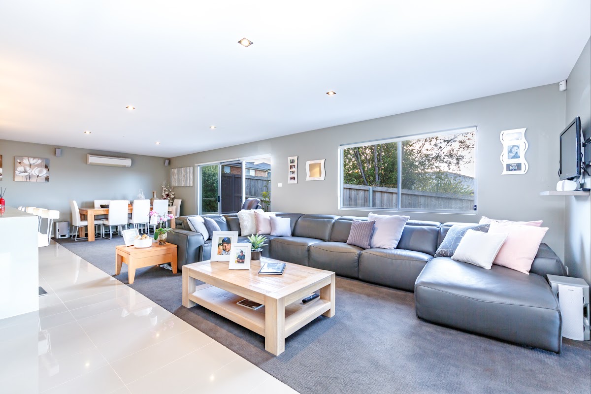 The open plan living dining and kitchen is a large area suitable for a family with children and pets. There are modern neutral tones used in the colour scheme drawing extra warmth and depth to the overall feel of the home.