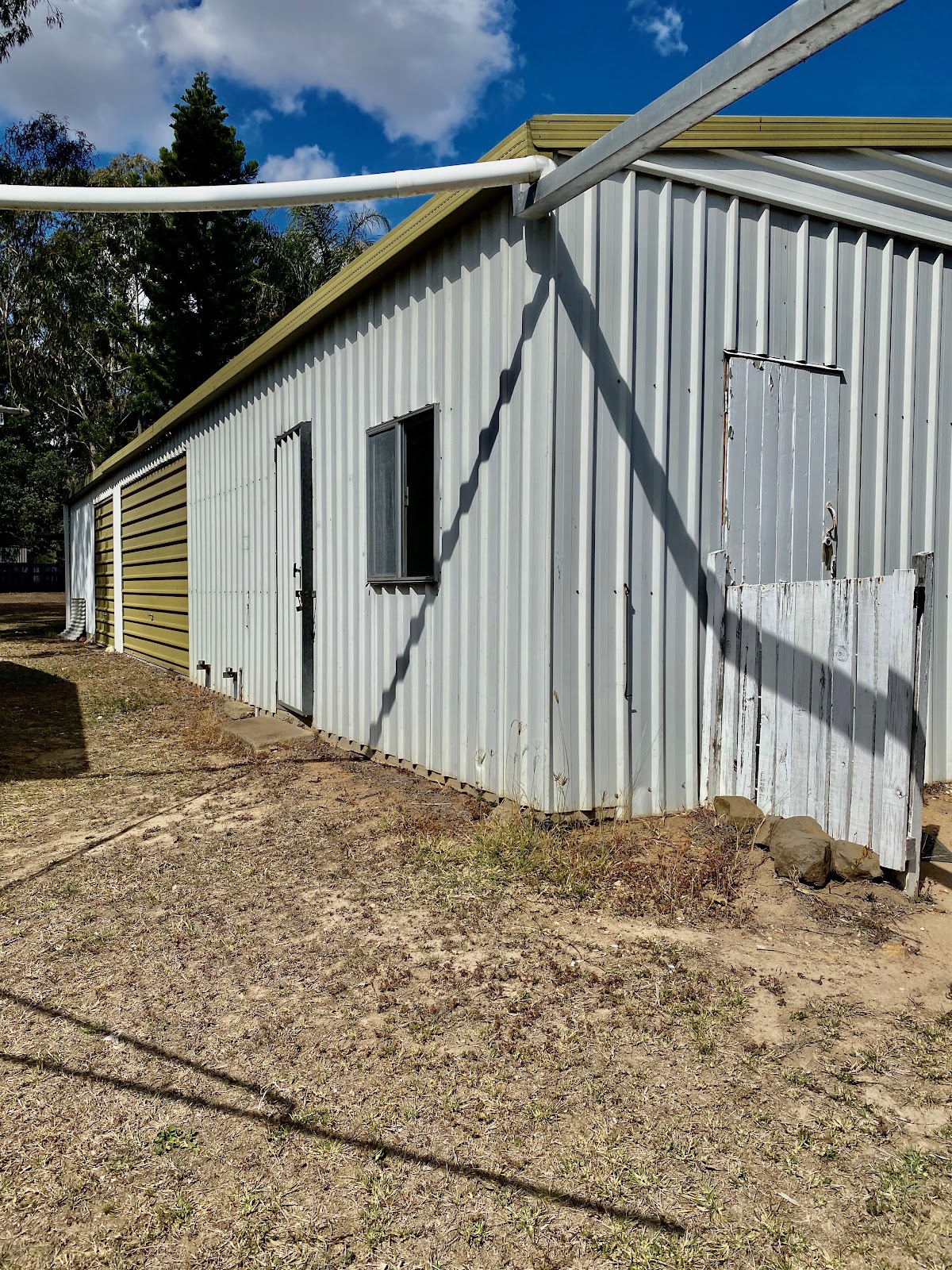 Cream shed has two doors plus extra space for workshop and a sep office or teenagers retreat – good concrete pad between the home and the shed for extra parking .