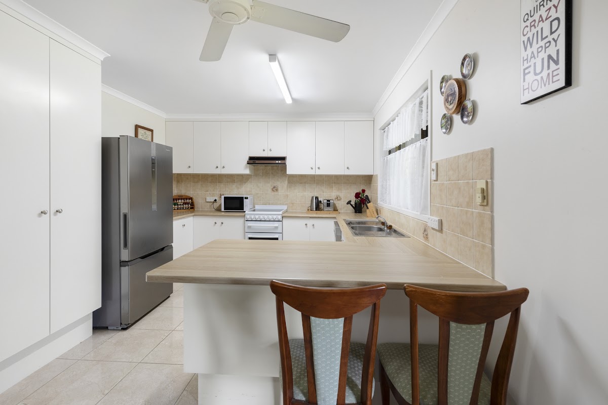 The comfortable kitchen features plenty of storage space, double door pantry, large fridge cavity plus also a breakfast bar.
