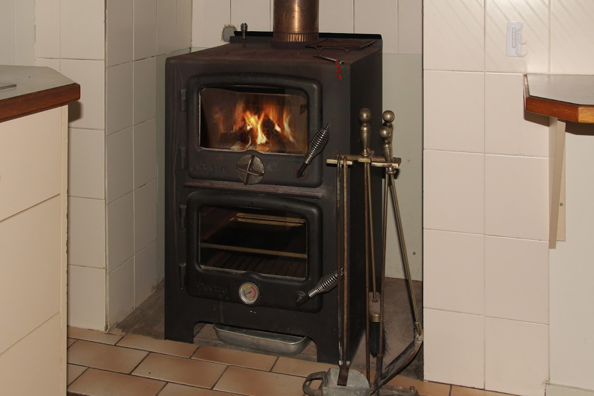 The modern kitchen has an upright gas stove and also an added feature is a modern combustion stove in the original fireplace.
