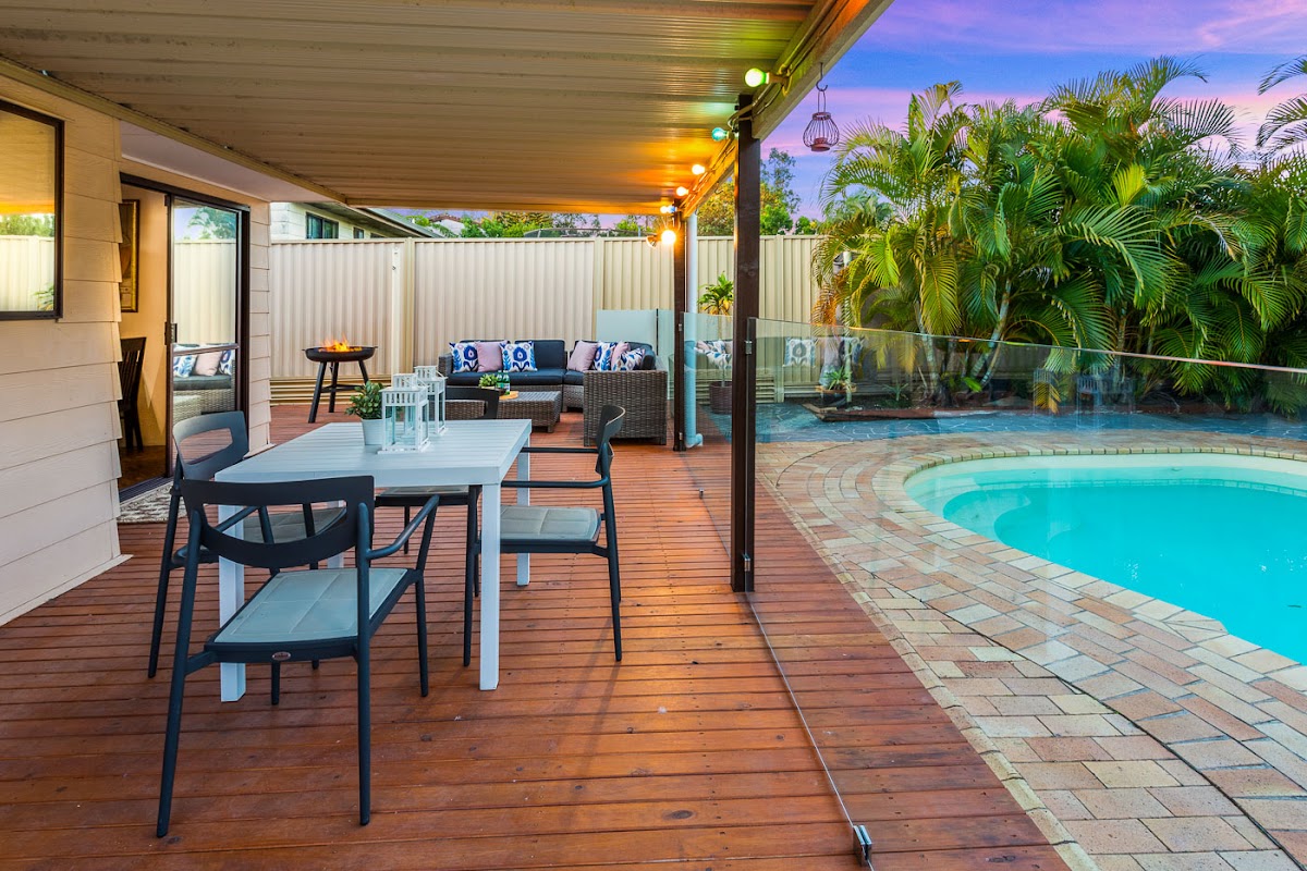 A housewarming party is in order with a gigantic and private outdoor alfresco deck & living area overlooking the stunning saltwater pool. It’s the most liveable and frequently used area in the whole house where you can unwind with a sunset cocktail and catch the cool breezes in the afternoon. This amazing back yard expands out at the rear in a unique way making this home one of a kind for versatility and space. There is so much room here to relax and enjoy life. Kid’s, pets and adults are all well catered for.