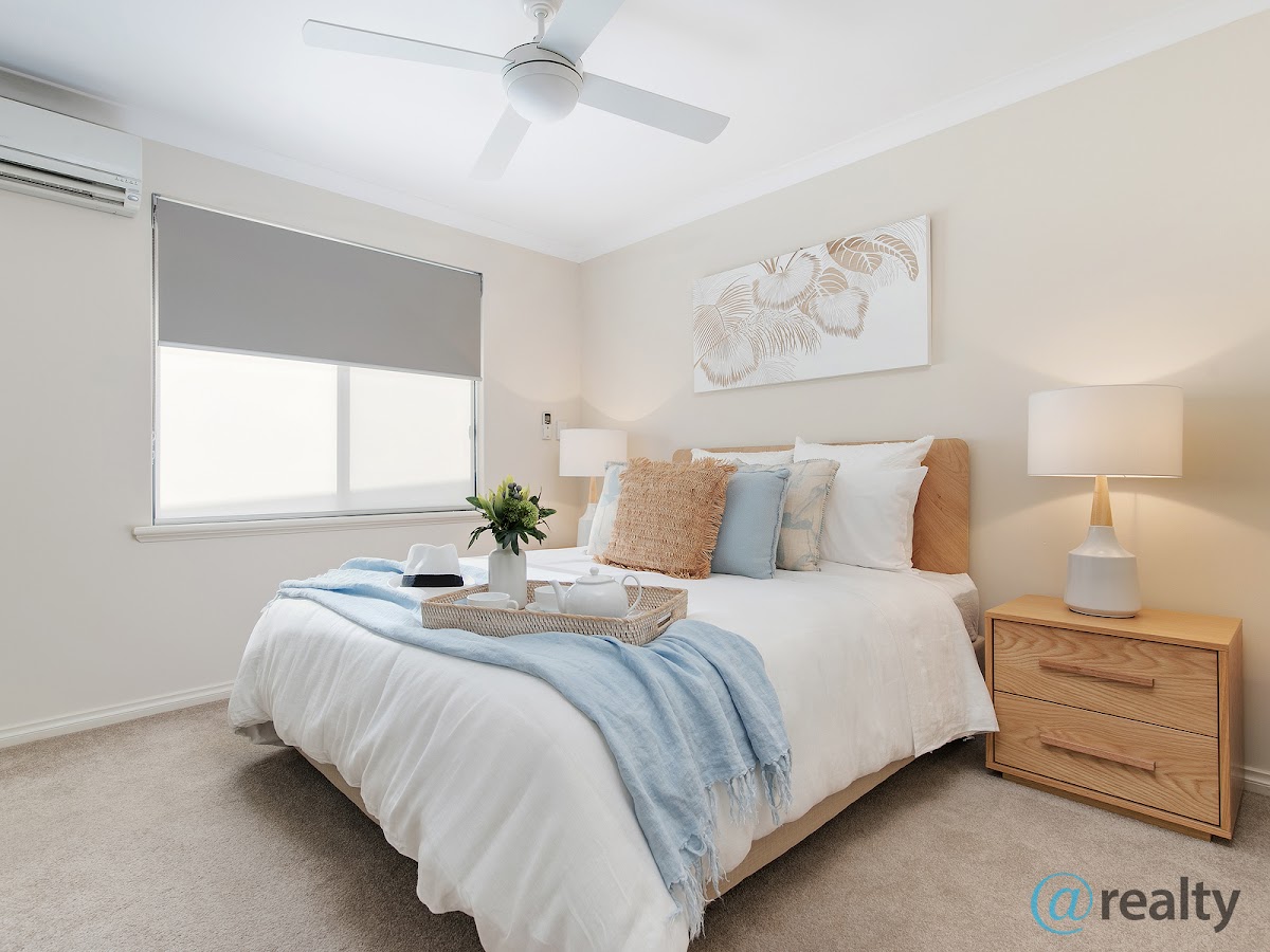 • Master bedroom with walk in robe and ensuite with lots of storage. This room also offers double roller blinds, a ceiling fan and a split system air conditioner.