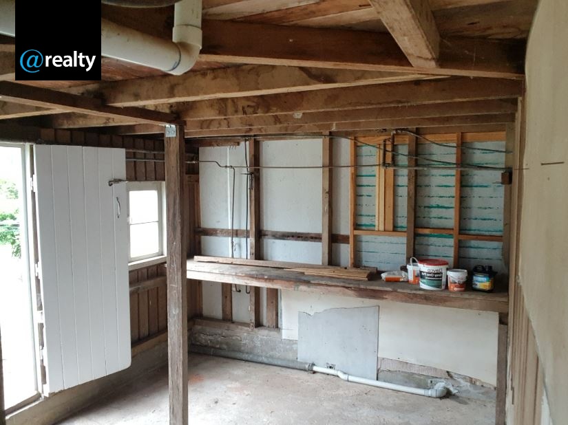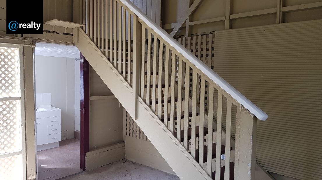 Downstairs is the large laundry with a high ceiling. Downstairs is also the bathroom with shower, toilet and vanity combined.
